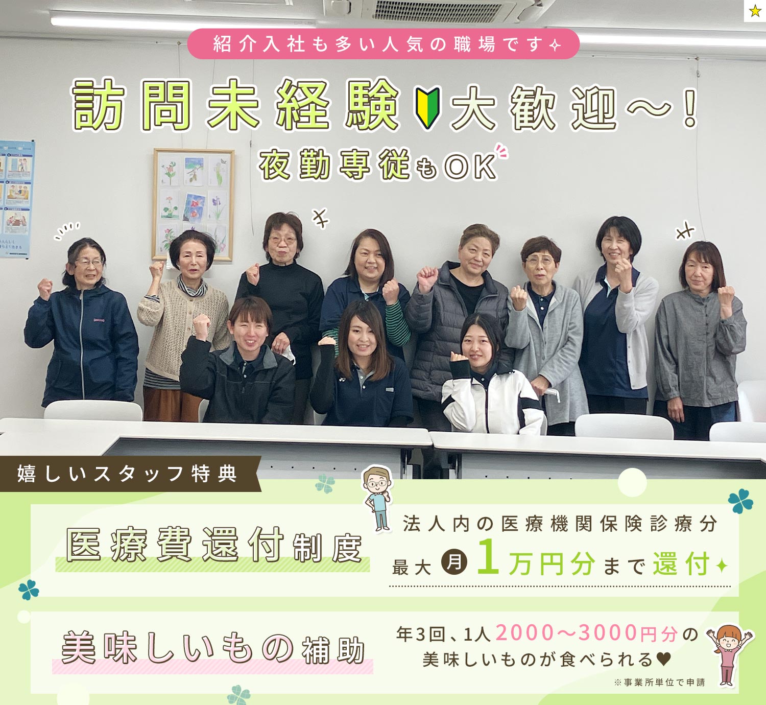 | 応募資格 | 介護職員初任者研修修了(旧ヘルパー2級)以上 #ブランクOK ※要普通自動車免許(AT限定可) ※訪問未経験OK ※男女・学歴不問 ※シニアやミドルも歓迎/定年60歳のため60歳までの方 |