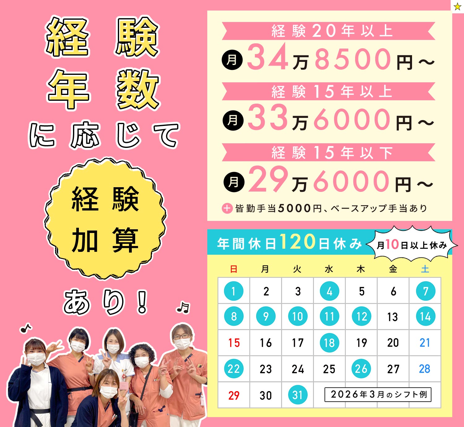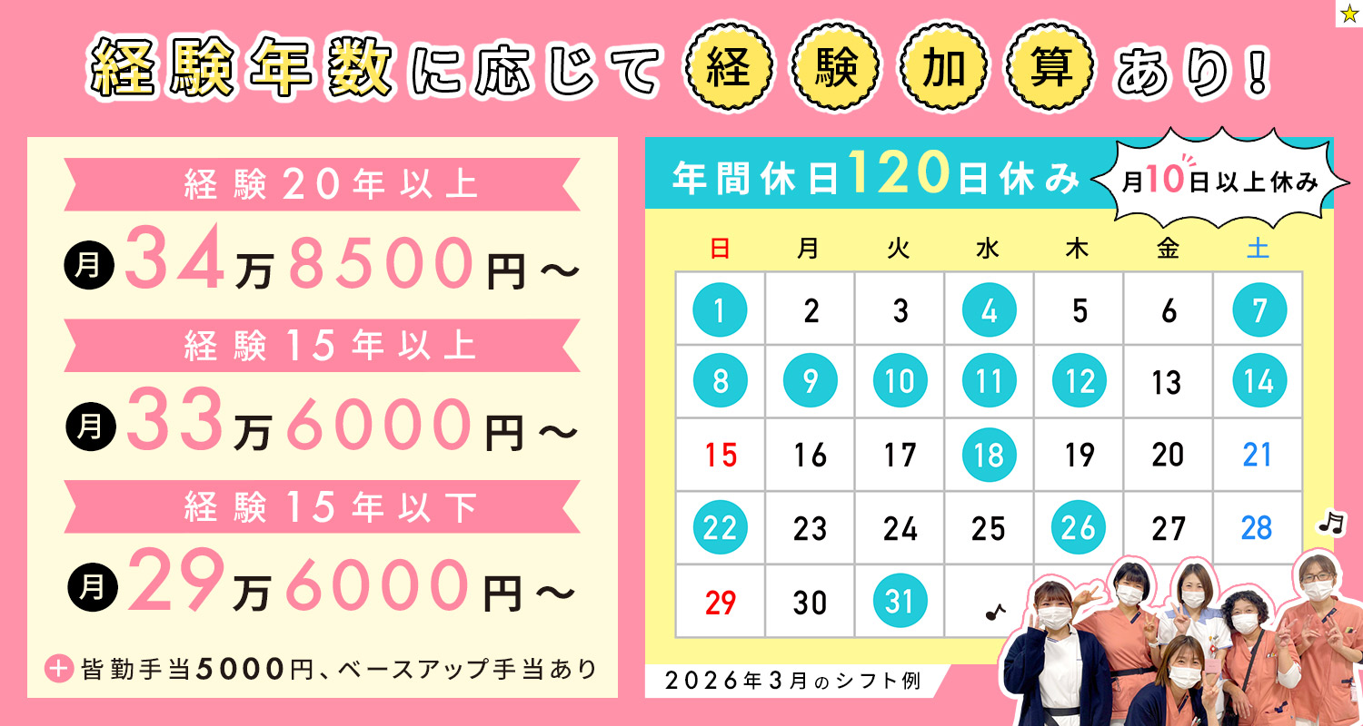 15年以上で月給33万6000円、看護師経験20年以上で月給34万8500円と高収入。