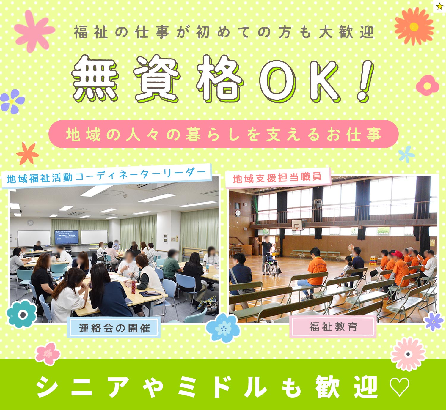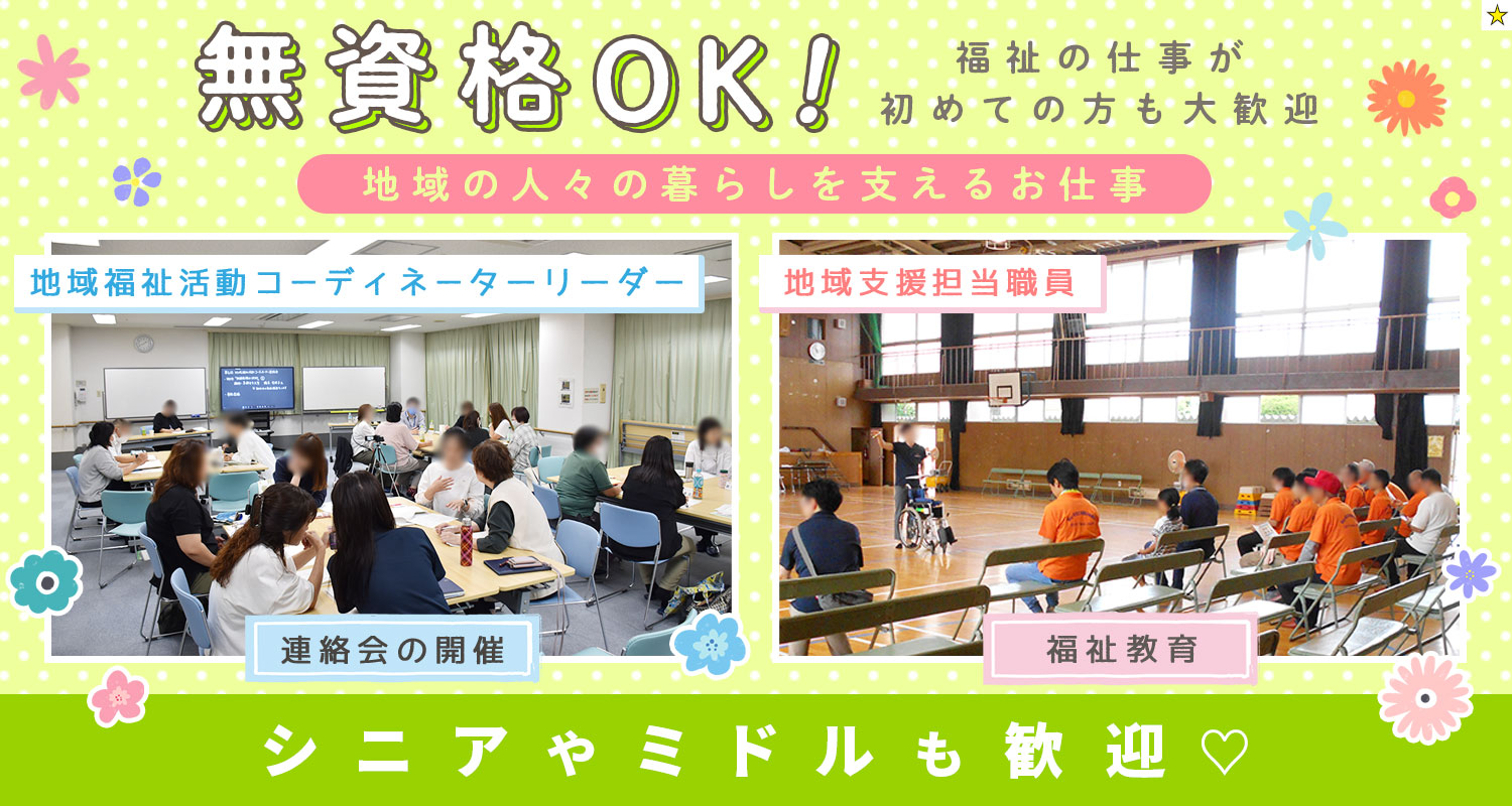 | 職 種 | (1)地域福祉活動コーディネーターリーダー(無資格OK) (2)地域支援担当職員(無資格OK) |
