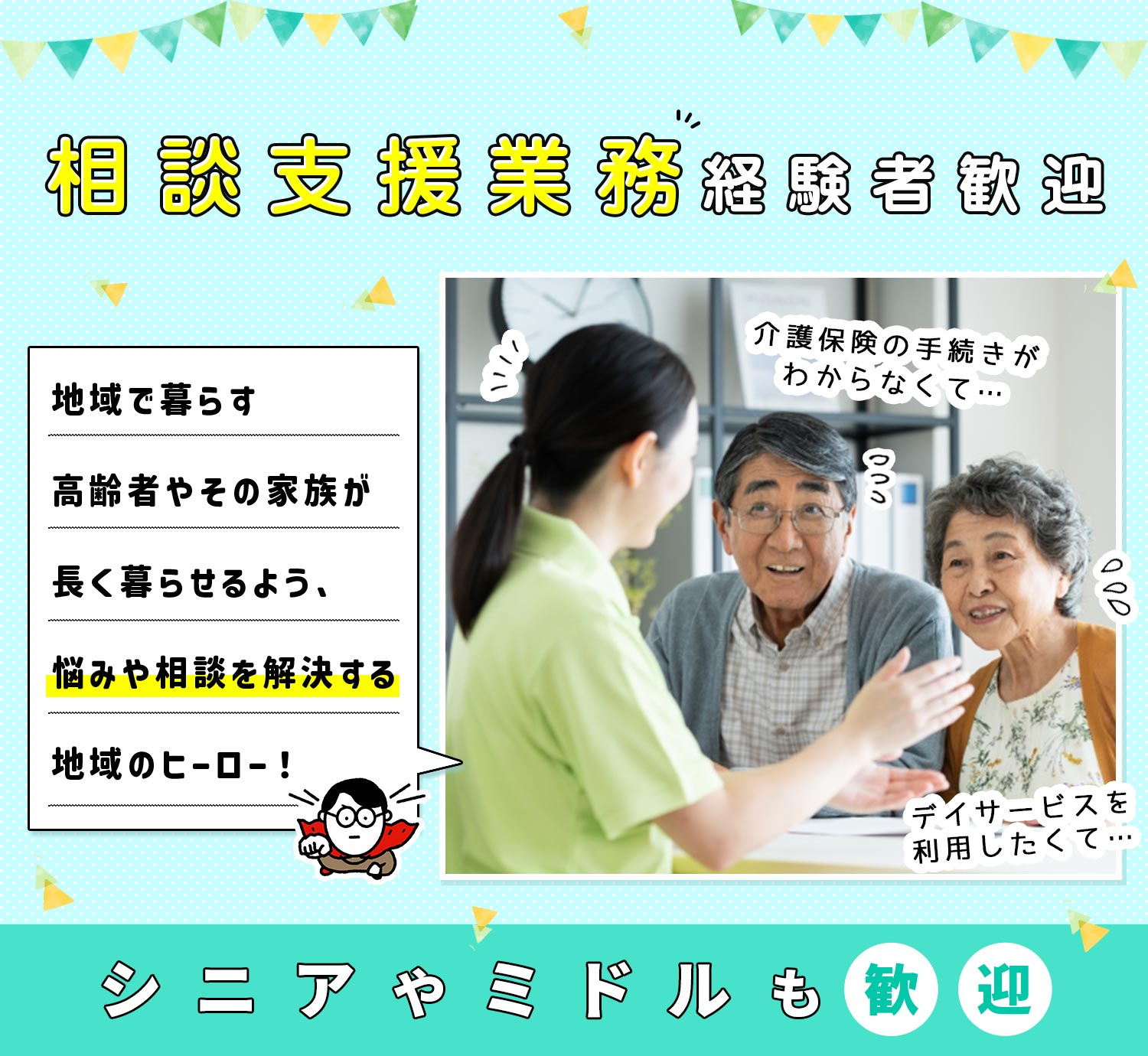 | 応募資格 | 社会福祉士 #ブランクOK ※基本的なパソコン操作ができる方(Excel・Wordなど) ※男女不問!シニアやミドルも歓迎 ※相談業務の経験がある方は大歓迎 ※訪問業務があるため自転車に乗れる方 ※契約社員:契約期間1年/原則更新 |