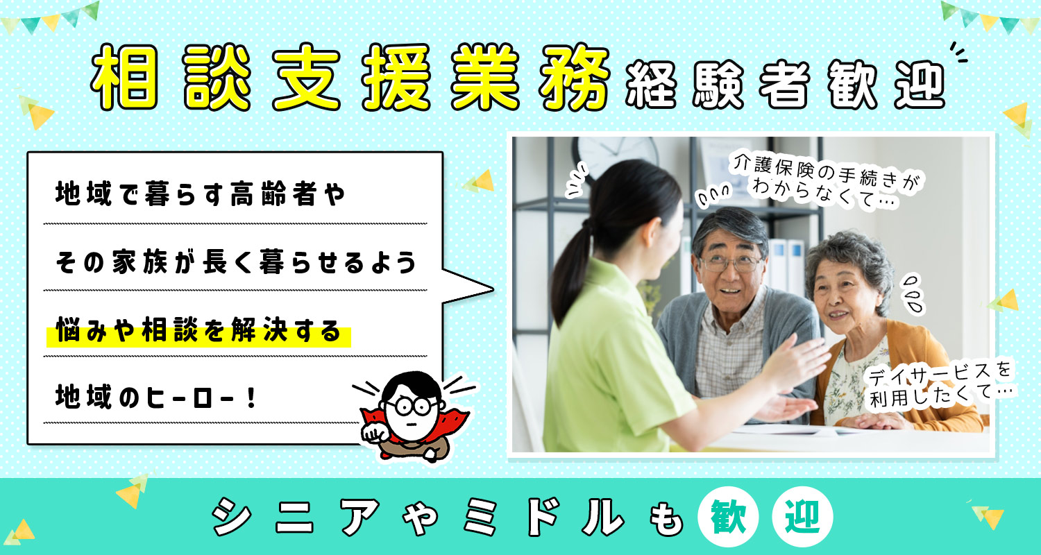 | 仕事内容 | 社会福祉士/地域包括支援センターの相談員[契] 地域包括支援センターにおける総合相談業務。 担当地域の高齢者の方々が住み慣れた町で安心して生活を送れるよう、高齢者や家族の福祉や介護の相談に対応します。 ・総合相談支援業務 ・権利擁護業務 ・介護予防のケアマネジメント業務 ・包括的・継続的マネジメント業務 ・関係機関との連絡・調整 など ※直接介護などの業務はありません。 ※訪問エリアは自転車で15分圏内。電動自転車貸与 ※社会福祉士2名、保健師1名、主任ケアマネ2名が在籍 |