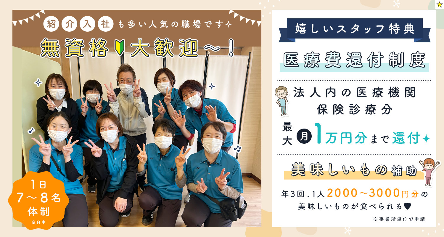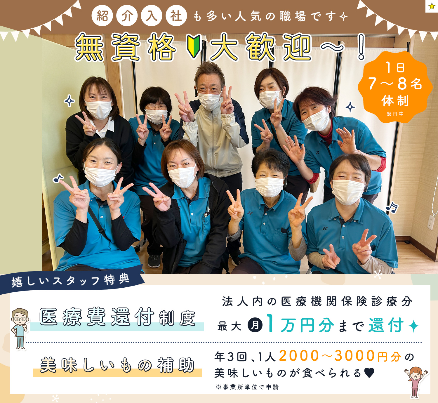 | 応募資格 | (1)無資格・未経験OK ※介護職員初任者研修(旧ヘルパー2級)以上の有資格者も歓迎 (2)介護福祉士 #ブランクOK ※男女・学歴不問 ※シニアやミドルも歓迎/定年60歳のため60歳までの方 ※普通自動車免許(AT限定可)ある方も歓迎/運転免許がなくても応募OK! |