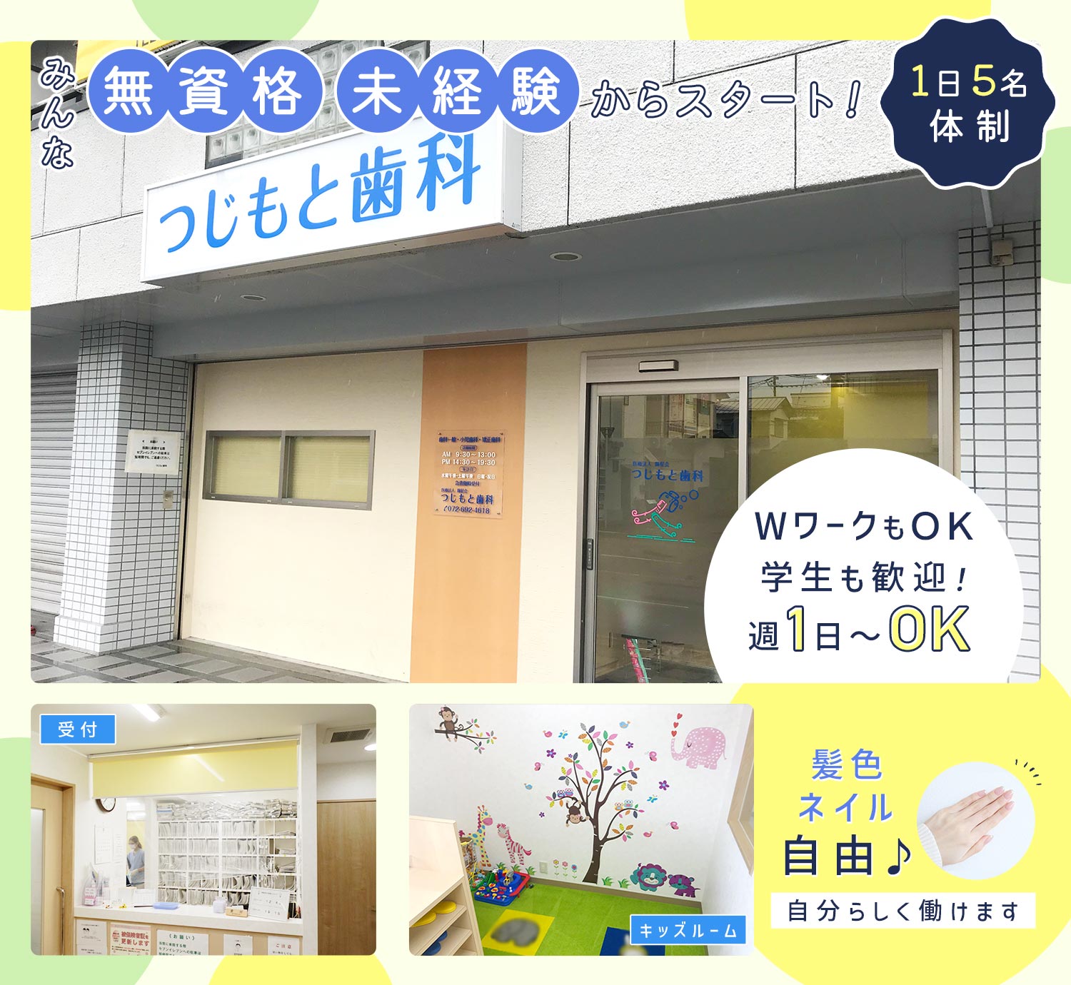 | 応募方法 | ◎ お気軽に【応募する】ボタンよりご応募ください ◎ 24時間受付中です □□□ 電話での応募も受付中! 「ジ ョ ブ ポ ス タ ー を見て応募したのですが」と、 お電話すると、スムーズです! 医院見学実施中! 1.院内の案内(休憩室や設備など) 2.スタッフ紹介(一緒に働く先輩をご紹介します) 3.質疑応答(気になることは何でも聞いてください) ※見学後、そのまま面接実施も可能です。 別日に面接を希望される場合は、日程を調整しますので 気軽におっしゃってください。 |