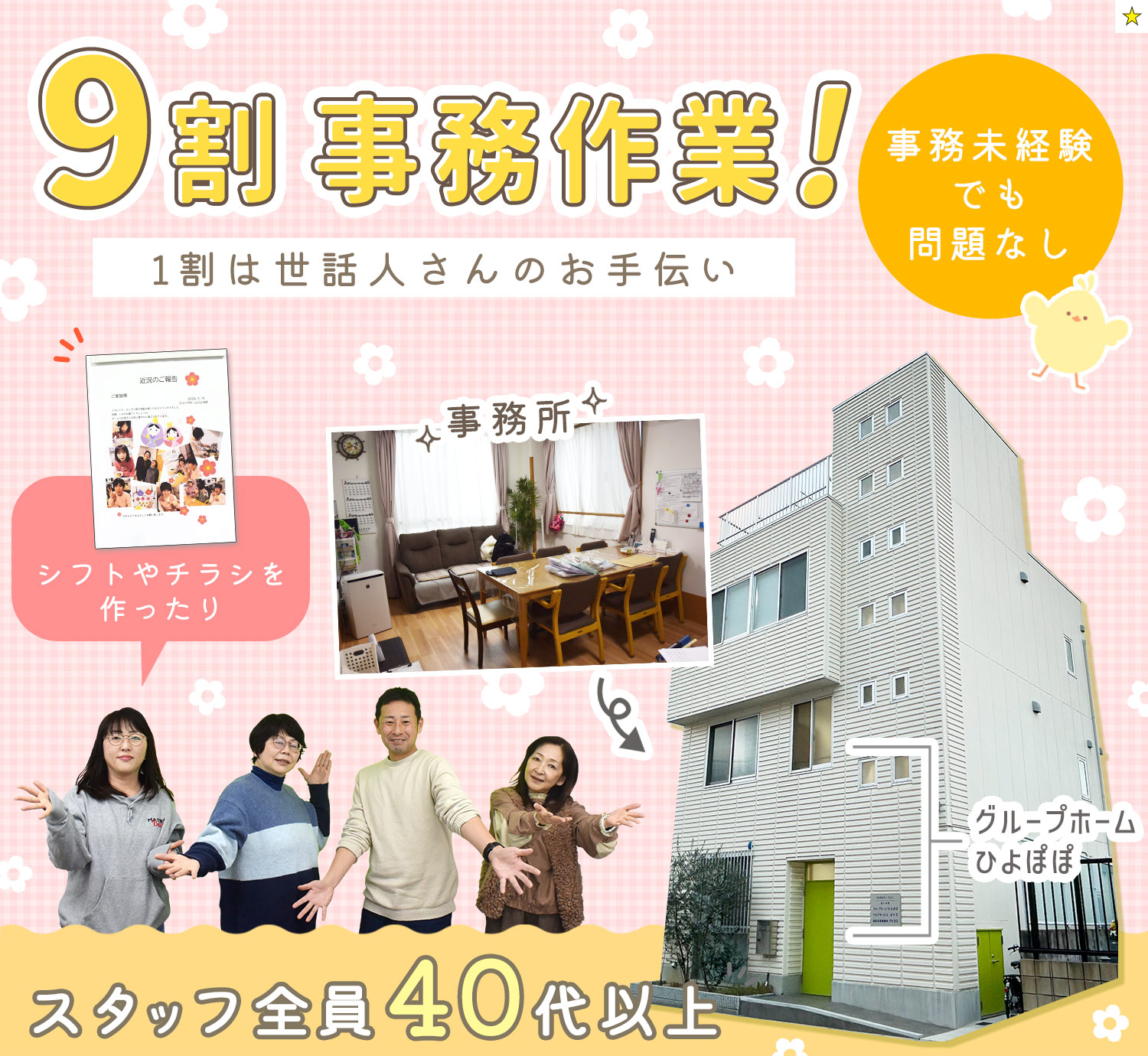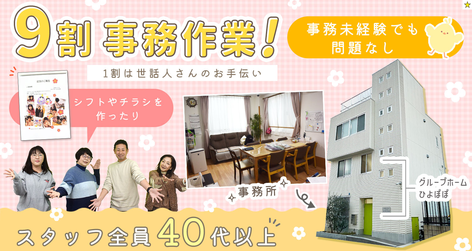 | 仕事内容 | (1)介護福祉士/事務9割の生活支援員[社] (2)介護職員/事務9割の生活支援員[社] 障がいをお持ちの方が暮らす定員7名のグループホームです。 1~2階がグループホームで、1階の事務所での勤務がメインです。 ホーム専属ヘルパーさんのシフト作成や簡単なチラシ作成などの事務作業のほか、利用者様の通院準備や利用者様の日用品の買い出しなどをお願いします。 15時頃に、先輩社員(世話人さん)が出勤した後は、その方のお手伝いをお願いします。 9~16時は利用者様は作業所におられるので、16時以降は介護業務のサポートもお願いします。 ※15時に世話人さんが出勤されるまでは、1人で事務作業! 急なお休みの際は、3階のあるヘルパーステーションの事務所の方が代わりに対応するのでご安心ください♪ <1日の業務例> 9:00~15:00 ※休憩1時間 ・ヘルパーさんのスケジュール管理 ・チラシや予定表作成 ・献立表作成(朝・昼のみ) ・利用者様の日用品買い出し ・利用者様の通院の準備 等 15:00~【世話人さん出勤】 ・世話人さんのお手伝い 16:00~ ・利用者様が作業所から帰宅 ・介護業務の簡単なサポート ~17:00退勤~ ★夜勤ナシ |