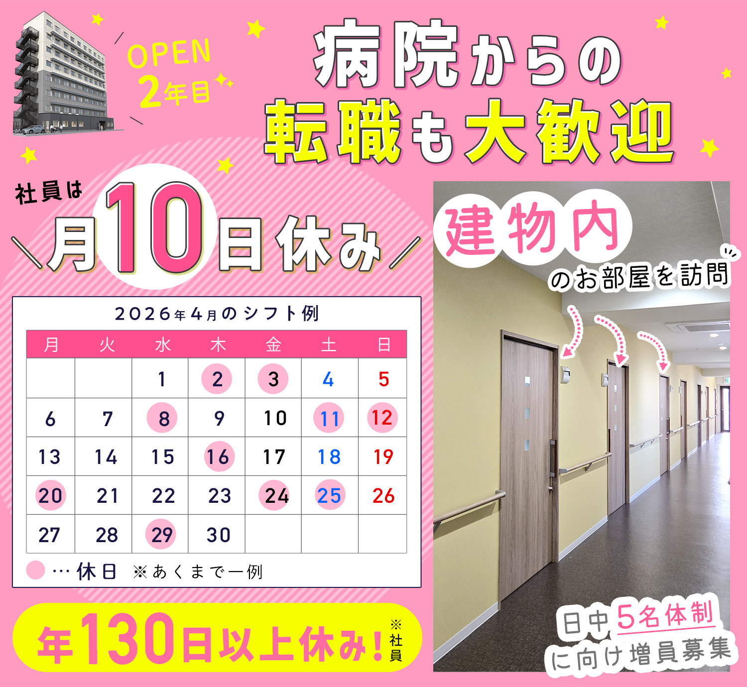 | 仕事内容 | (1)看護師[パ] (2)看護師/週4日以上[パ] OPEN2年目の綺麗な住宅型有料老人ホームでの看護業務全般。 入居者様の健康管理の他、服薬管理、医師の指示に基づく処置、介護スタッフへのサポートなどをお願いします。 入居者様お一人につき平均20~30分程の時間を使い看護が出来ます。 病棟勤務でバタバタと忙しく、なかなか患者様に寄り添う看護が出来なかった方も、当施設なら一人ひとりとコミュニケーションをとり、関係を築きながら丁寧に向き合う看護が実現できますよ◎ |
