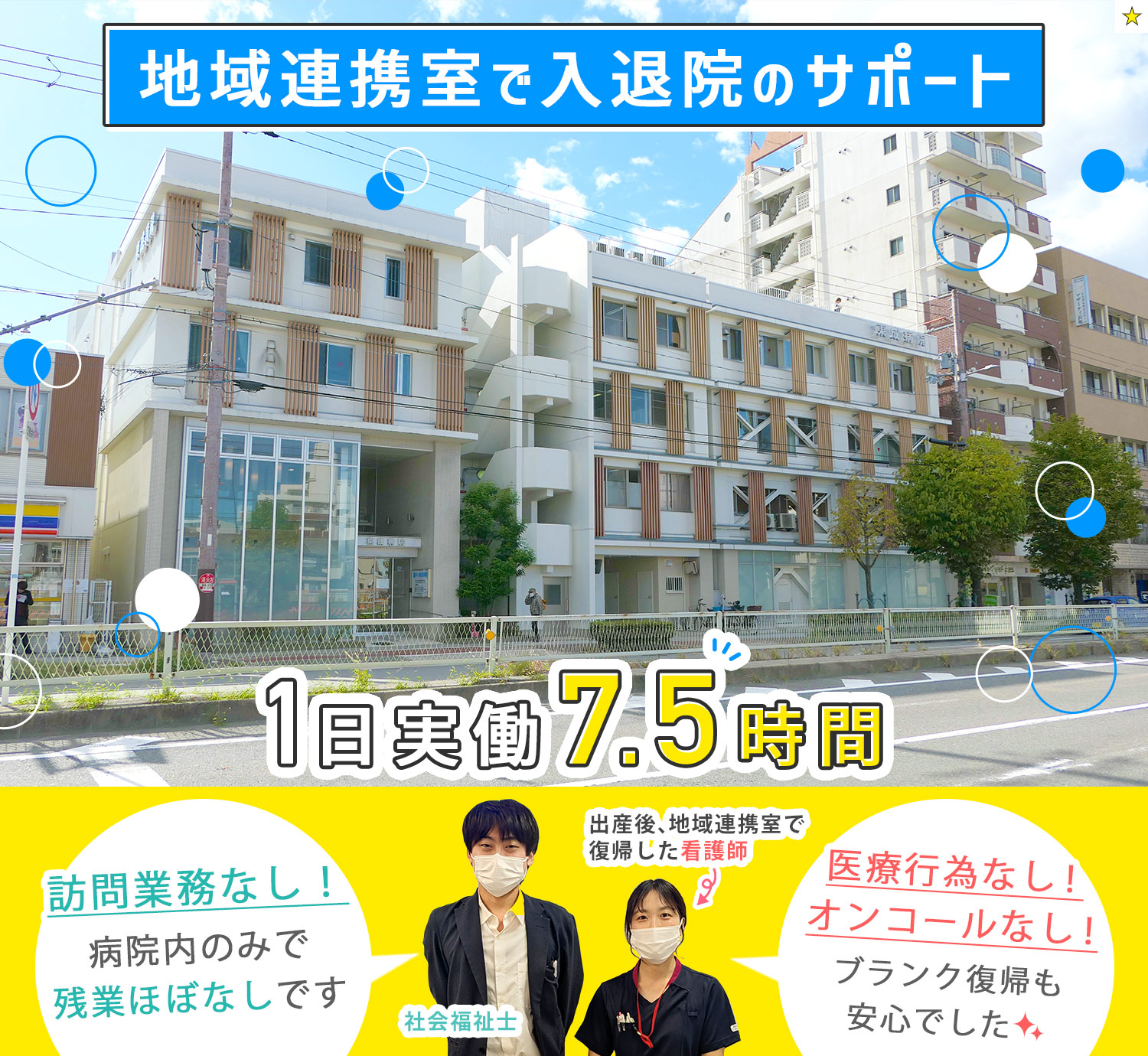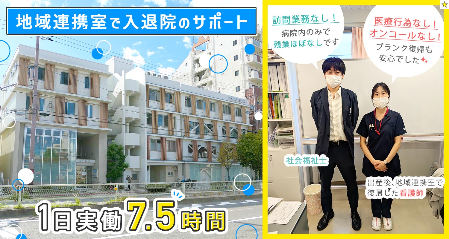 | 仕事内容 | 地域連携室の看護師/実働7時間30分[社] 地域連携室で、患者様の入退院などの調整・相談業務全般をお願いします。 患者様やご家族への医療・福祉に関する相談業務や、院内の病診・病棟連携業務、各医療機関への調整業務など、患者様の入院から退院までサポートしていただきます。 30名前後の患者様をスタッフ2名で対応。担当いただく患者様数は1人あたり10~15名と少人数。一人ひとりとしっかり向き合いながら働けますよ。 わからないことはすぐに先輩に聞ける環境です◎ ★入院調整 ・クリニックや施設等からの問い合わせ対応(主に電話) ・院内の専門医へ情報連携 ・入院日など各所へスケジュール調整 ★退院調整 ・患者様やご家族の方と退院後の相談(例:デイサービスや介護老人保健施設の紹介、ご自宅での療養など) ★相談業務のみ ★医療行為、訪問業務、オンコール一切なし! |