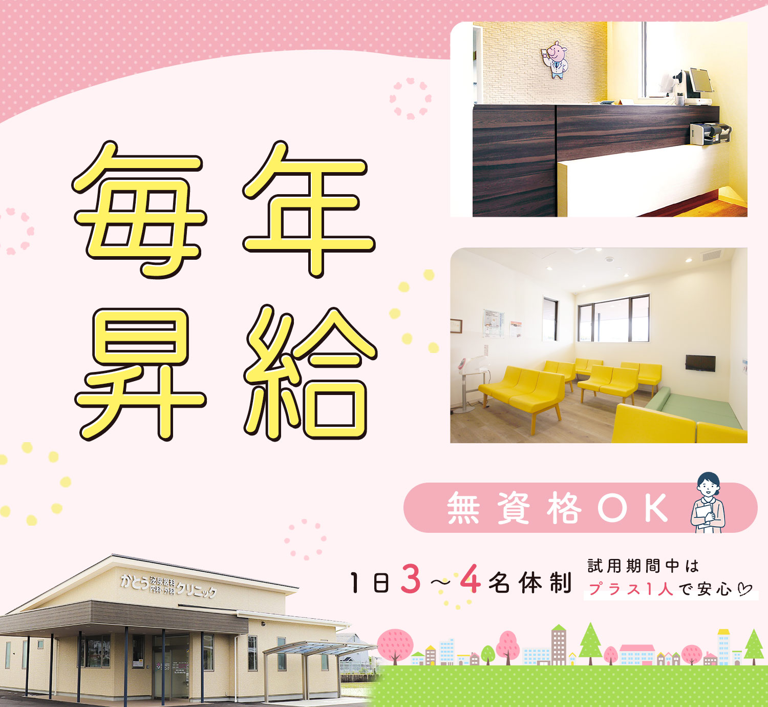 | 給 与 | 時給1200~1800円 ※午後診療の勤務時は時給1300円~1800円 ※経験・能力を考慮 ※試用期間2ヶ月(時給1180円) |