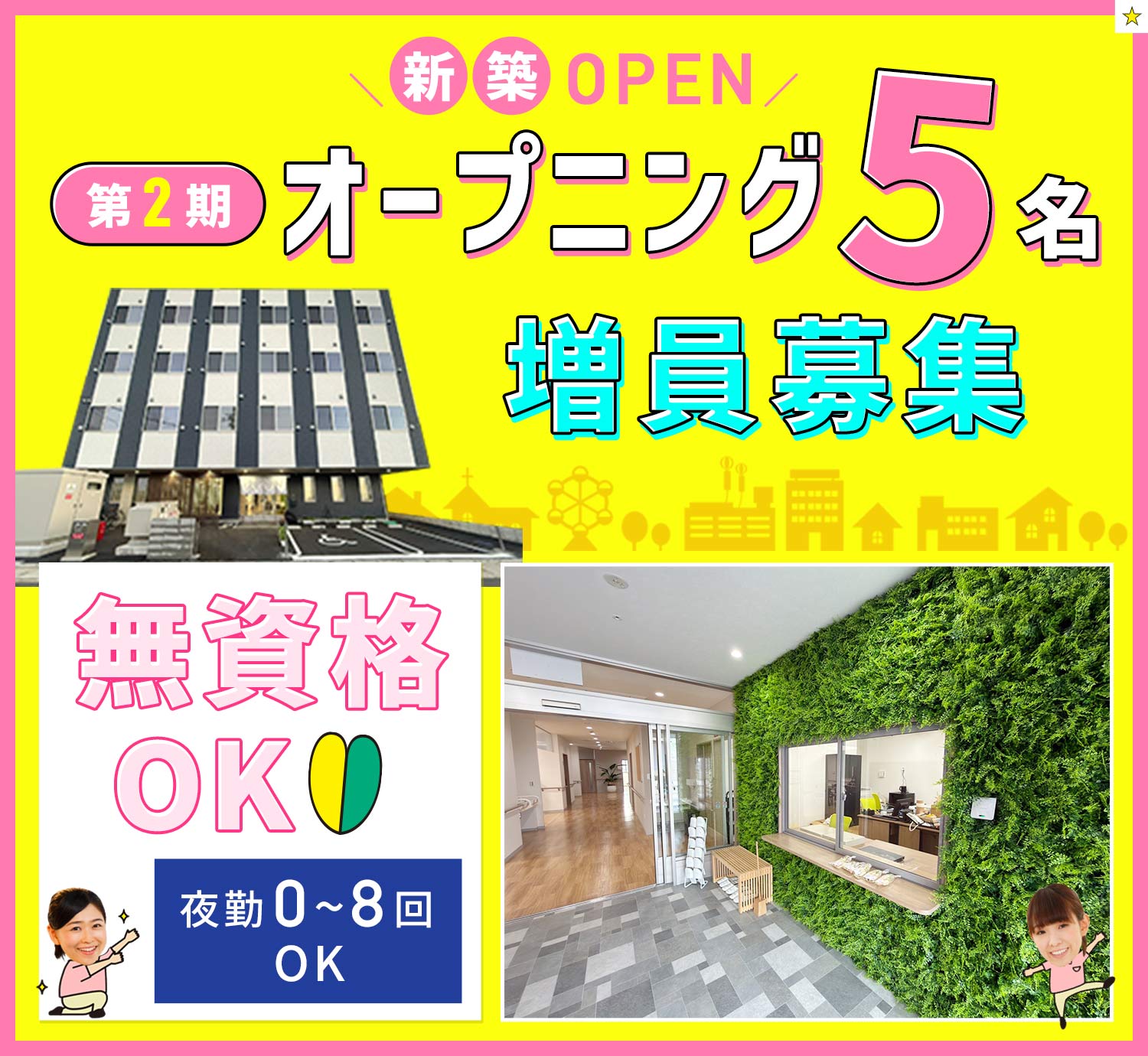 | 仕事内容 | (1)介護職/第二期オープニング[社] (2)日勤のみの介護職/第二期オープニング[社] 2025年11月完全新築OPENの住宅型有料老人ホームでの介護業務全般。 入居者様の身の回りのお世話(食事・入浴・排泄・生活援助)などをお願いします。 ※夜勤時は夜間の見回りや経過記録の記入、起床準備など ※24時間看護師常駐!夜勤は4名体制で安心(介護職2名+看護師2名) ※ケア記録はタブレット入力!事務作業の負担を軽減 |
