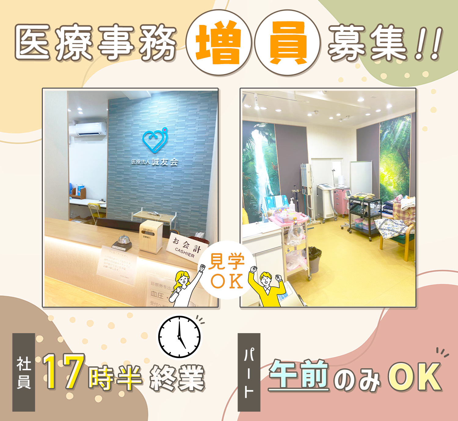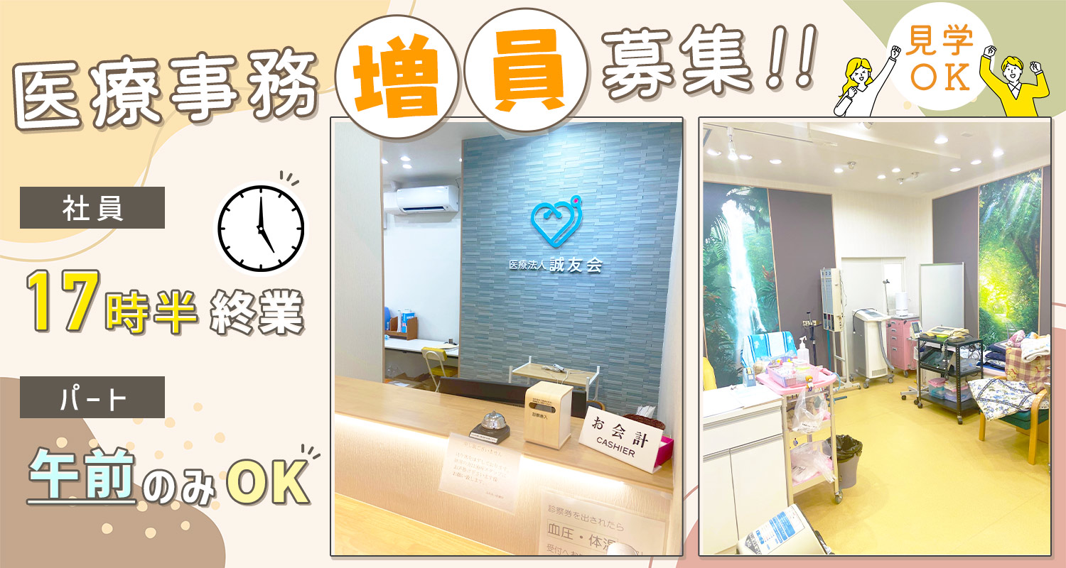 | 仕事内容 | 医療事務/経験者[社] 茨木誠友クリニックで、医療事務業務全般をお任せします。 ・受付、来院された患者様のご案内、電話応対 ・個人ファイルの作成、受け渡し ・会計入力業務 ・レセプト業務 など ※電子カルテを導入 作業の負担が少なく、入力をサポートする機能で正確・簡単に扱えます! ブランクがあって操作が不安な方も、すぐに慣れて頂けるのでご安心ください◎ |