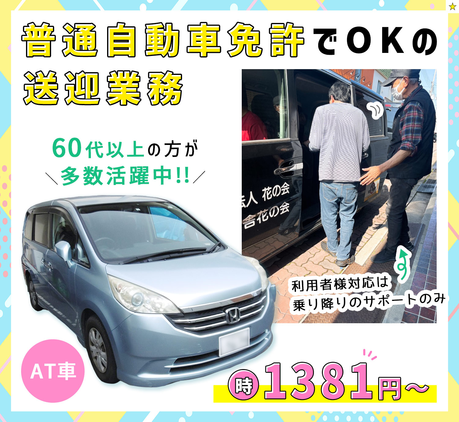 ワゴン車(AT限定可)が運転できれば、送迎未経験の方も大歓迎!