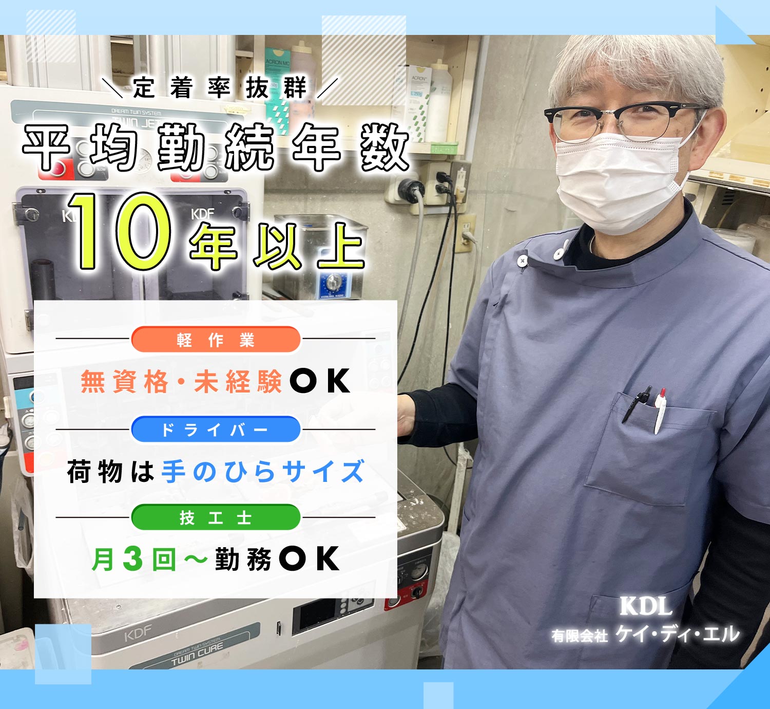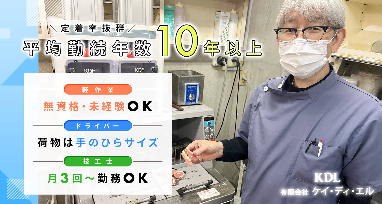 | 仕事内容 | (1)軽作業/シニアやミドルも歓迎[パ] (2)配送ドライバー/シニアやミドルも歓迎[パ] (1)軽作業スタッフ 技工士のお手伝い(削った模型の水洗いなど)や簡単な軽作業をお任せします。 (2)配送ドライバー 完成した技工物(片手で持てる軽い物)を歯科医院に配達 1日3件程度 配達エリア:大阪市内 ※普通車での配達 |