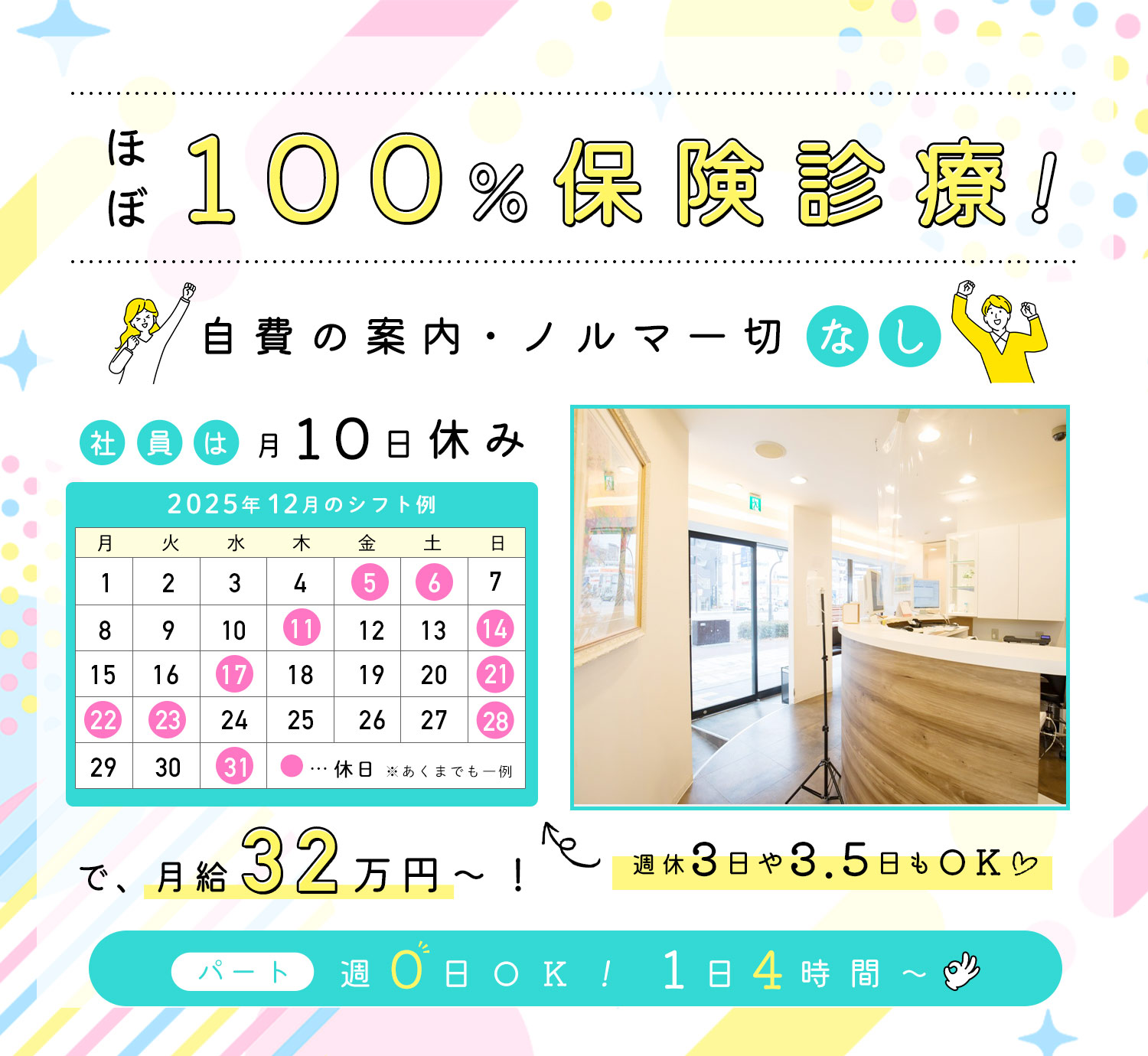 ※ほぼ100%保険診療・一般歯科。自費診療の案内やノルマは一切なし