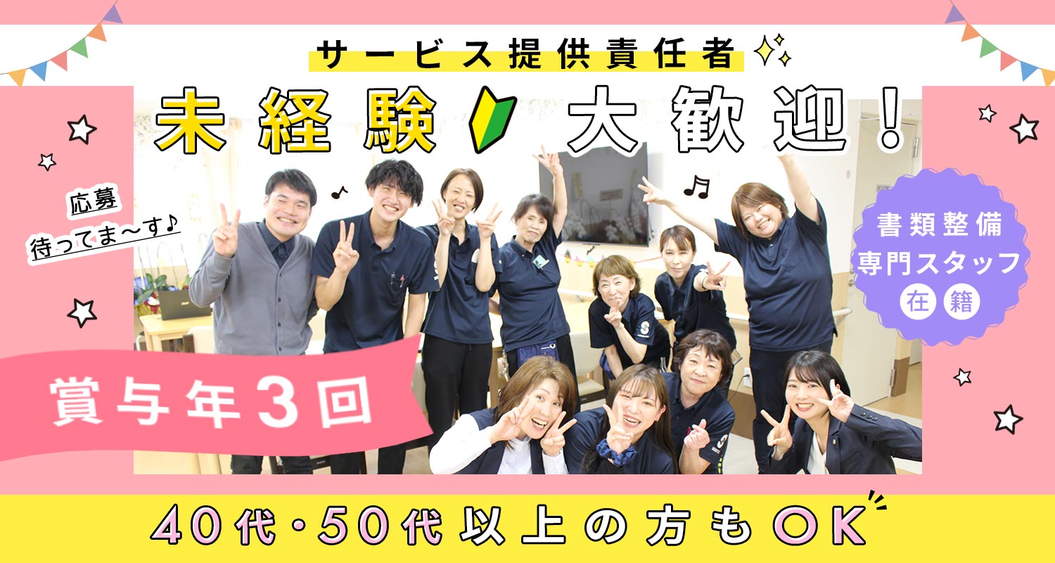 | 応募資格 | 介護福祉士実務者研修修了(旧ヘルパー1級)または介護福祉士 #ブランクOK ※サ責未経験OK・男女不問 ※ミドルも歓迎 |