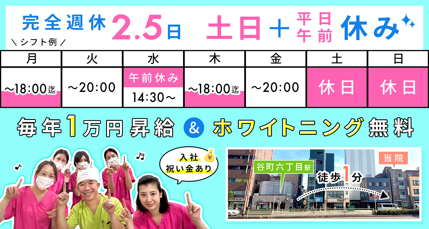 | 待 遇 | #入社祝い金あり (実務経験者2万円、実務未経験者1万円)※入職3ヶ月経過後に支給 #賞与あり 年2回 ※規定有 #昇給あり 年1回(毎年1万円※上限なし) 雇⽤・労災保険 ⻭科医師国保 厚⽣年⾦ #交通費全額⽀給 皆勤手当(5000円/月) バイク・⾃転⾞通勤OK(駐輪場無料) 外部講習費全額⽀給 #制服貸与 勉強会あり スタッフルームあり ホワイトニング無料(スタッフ特典) 体幹トレーニング(週1回) 退職金制度(勤続3年以上) 家賃補助(医院規定による) ※各種規定有 |