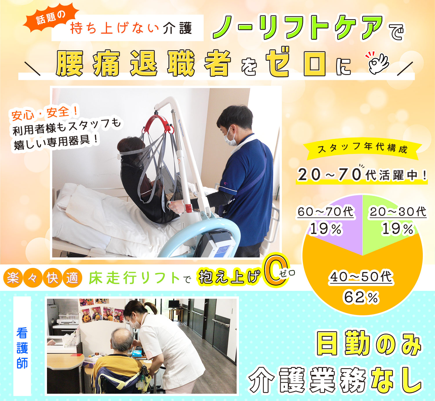 スライディングボード、床走行式リフト、入浴介助専門パートの配置などにより、腰痛による退職者はゼロ◎