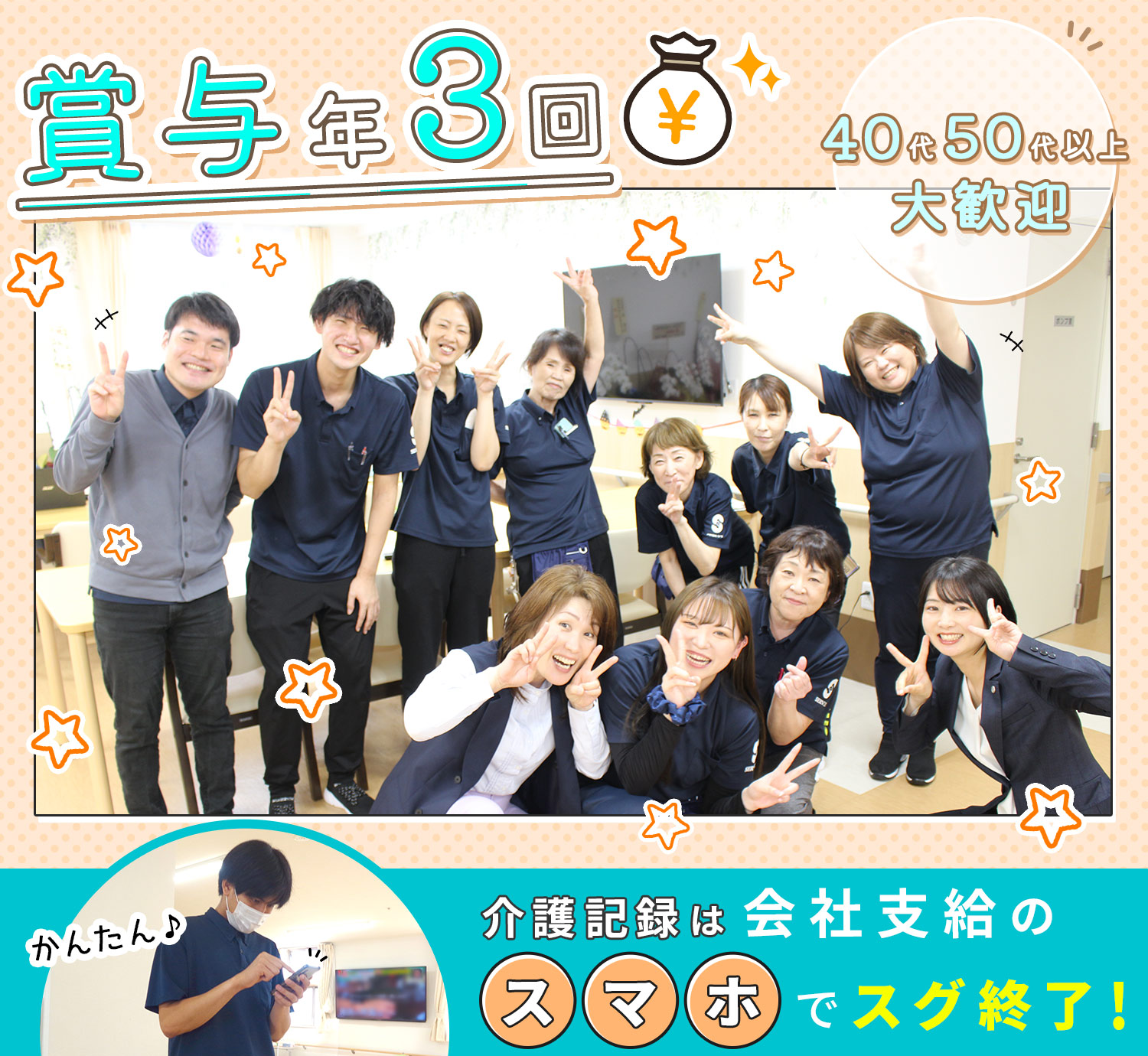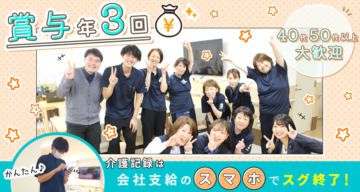 | 応募方法 | ◇ お気軽に【応募する】ボタンよりご応募ください ◇ 24時間受付中です 私服面接OK! まずは見学も歓迎!※希望者のみ 施設の雰囲気や一緒に働く仲間を見てからの応募でも大丈夫です。 □□□ 電話での応募も受付中! 「ジ ョ ブ ポ ス タ ー を見て応募したのですが」と、 お電話すると、スムーズです! |
