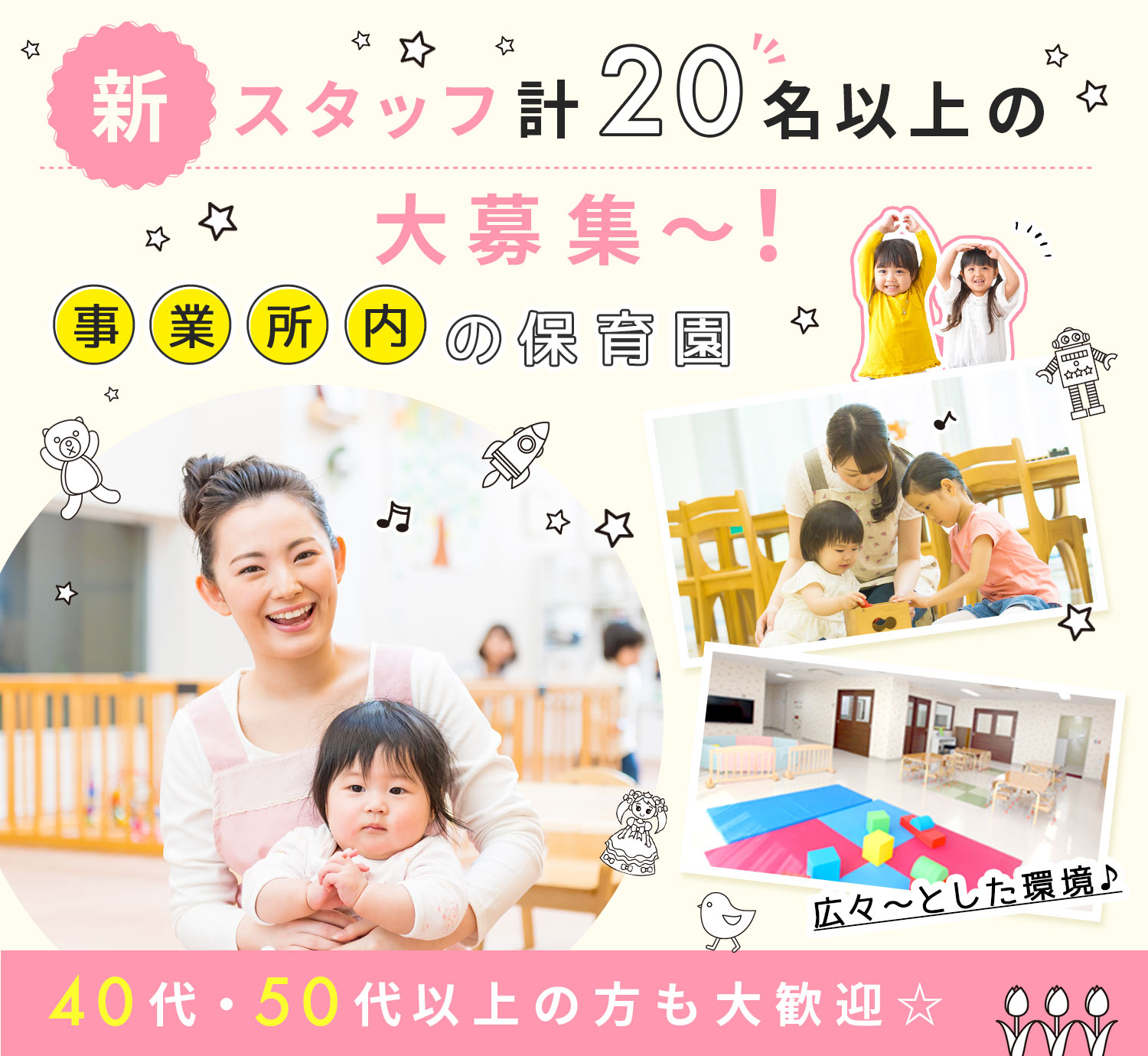 | 応募資格 | (1)要保育士免許 (2)無資格・未経験OK #ブランクOK ※実務経験不問 ※年齢不問(ミドルも歓迎) ※かけもち・WワークOK |