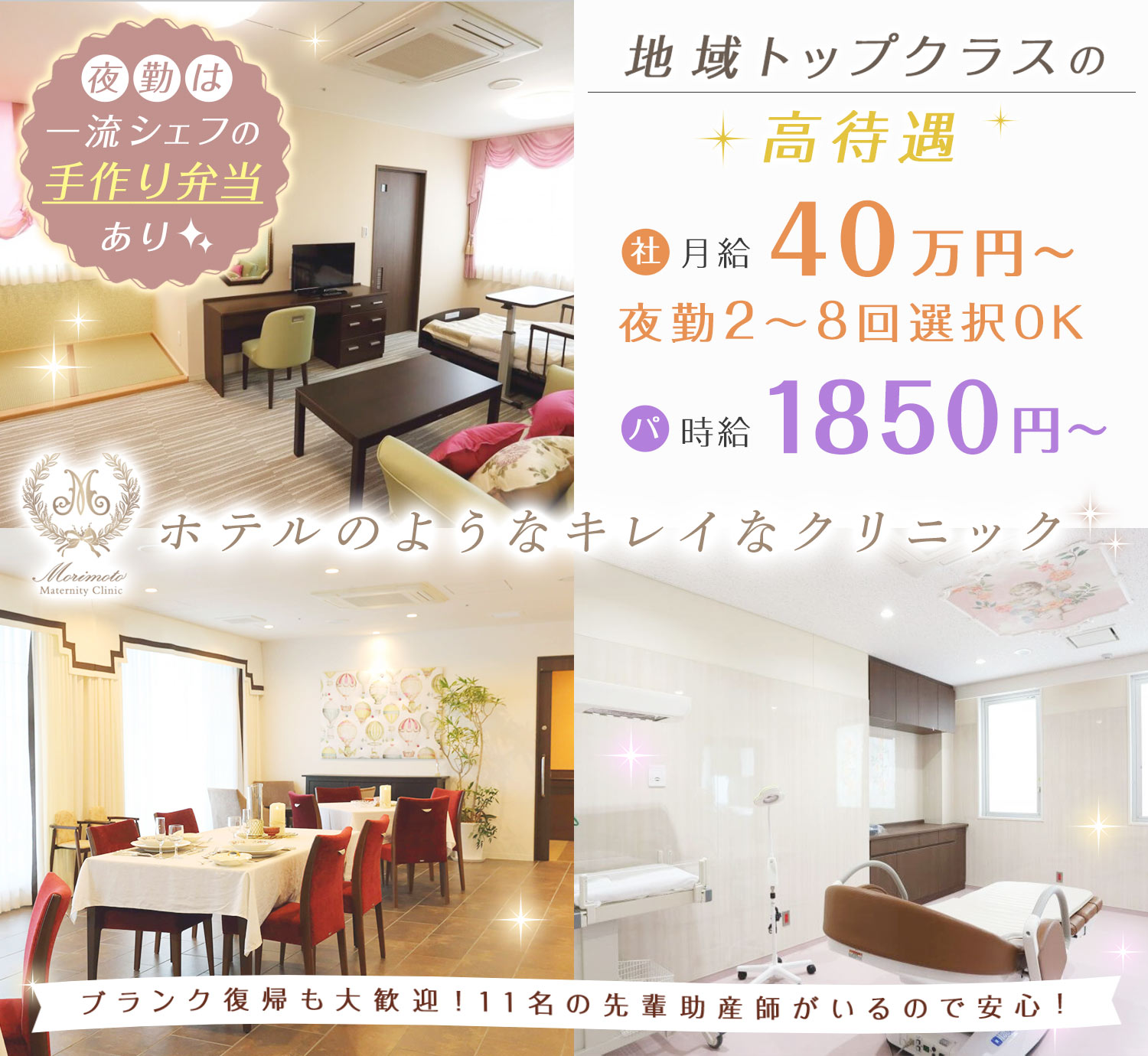 | 応募資格 | 要助産師免許 #ブランクOK □□□ ※社員の初年度は、契約社員として雇用(試用期間後は給与等、条件変動なし)。 ※新卒もOK! ※第二新卒もOK ※シニアやミドルも歓迎! ※4月入職できる方歓迎! <産婦人科未経験の方、ブランクある方も大歓迎!> 慣れるまでは、先輩スタッフがしっかりフォローする体制を整えています。 無痛分娩未経験の方や「産婦人科に興味があり、チャレンジしてみたい!」という方も、丁寧に指導していきます! |