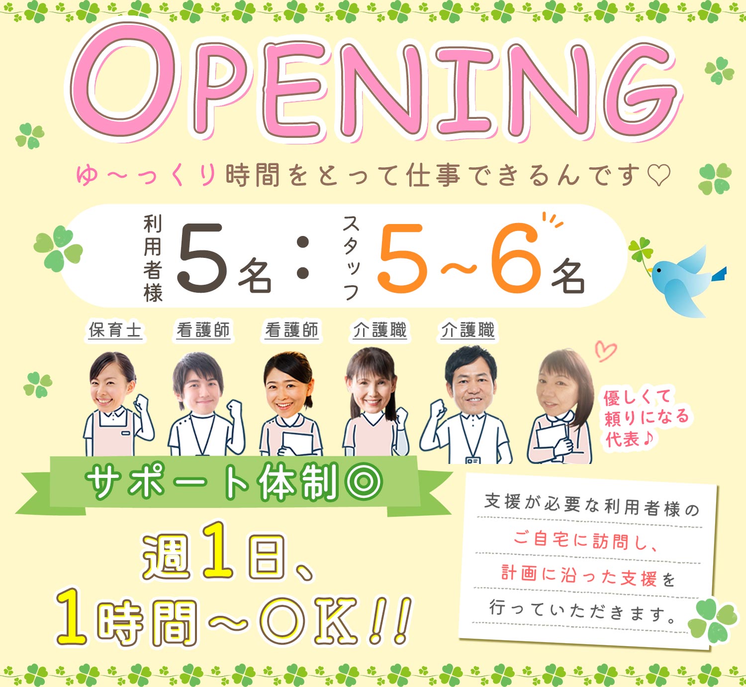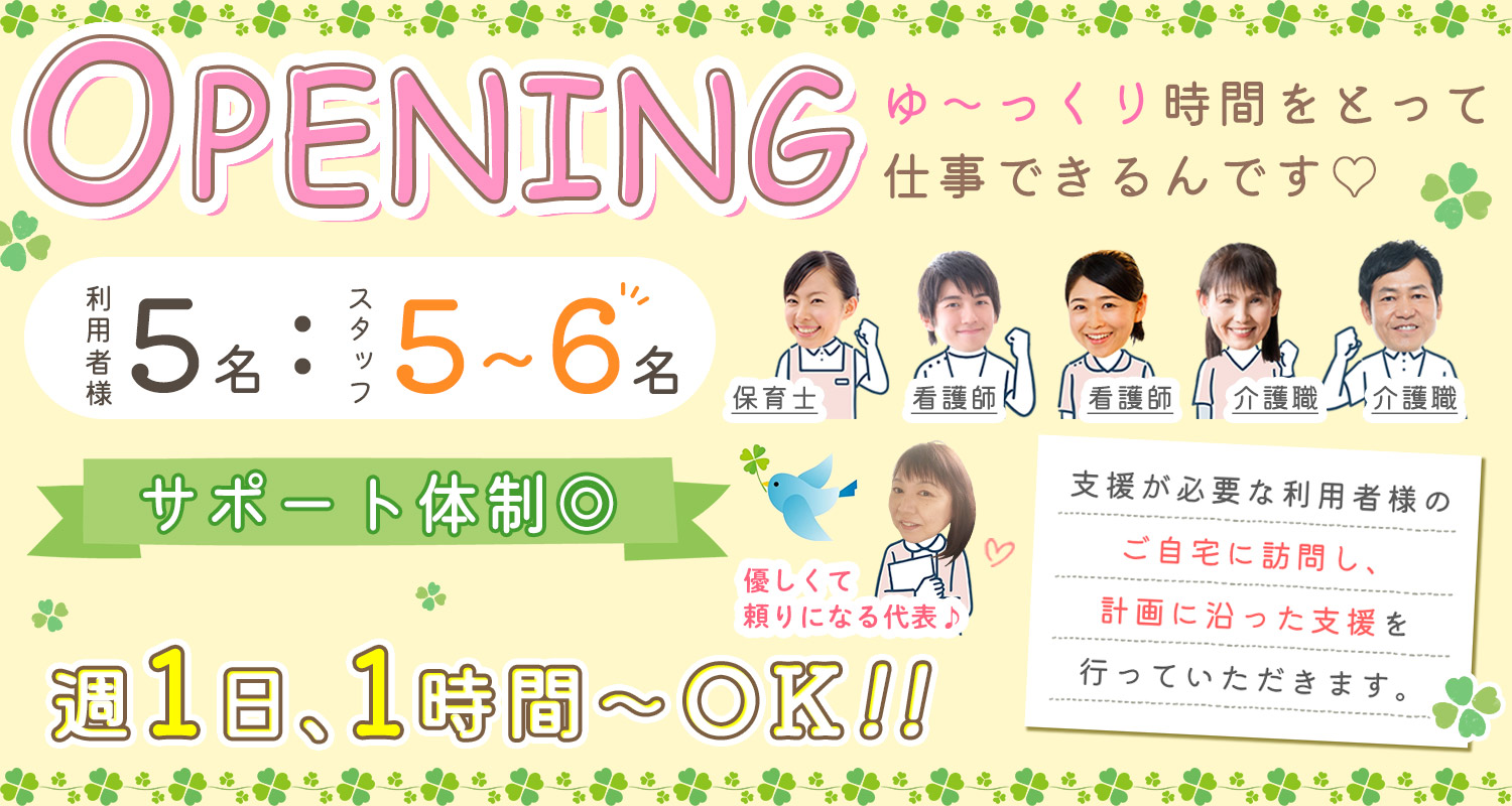 | 休日・休暇 | 週1日、1時間~勤務OK ※週5日・フルタイムでの勤務も歓迎 ※有給休暇あり(消化率100%) |