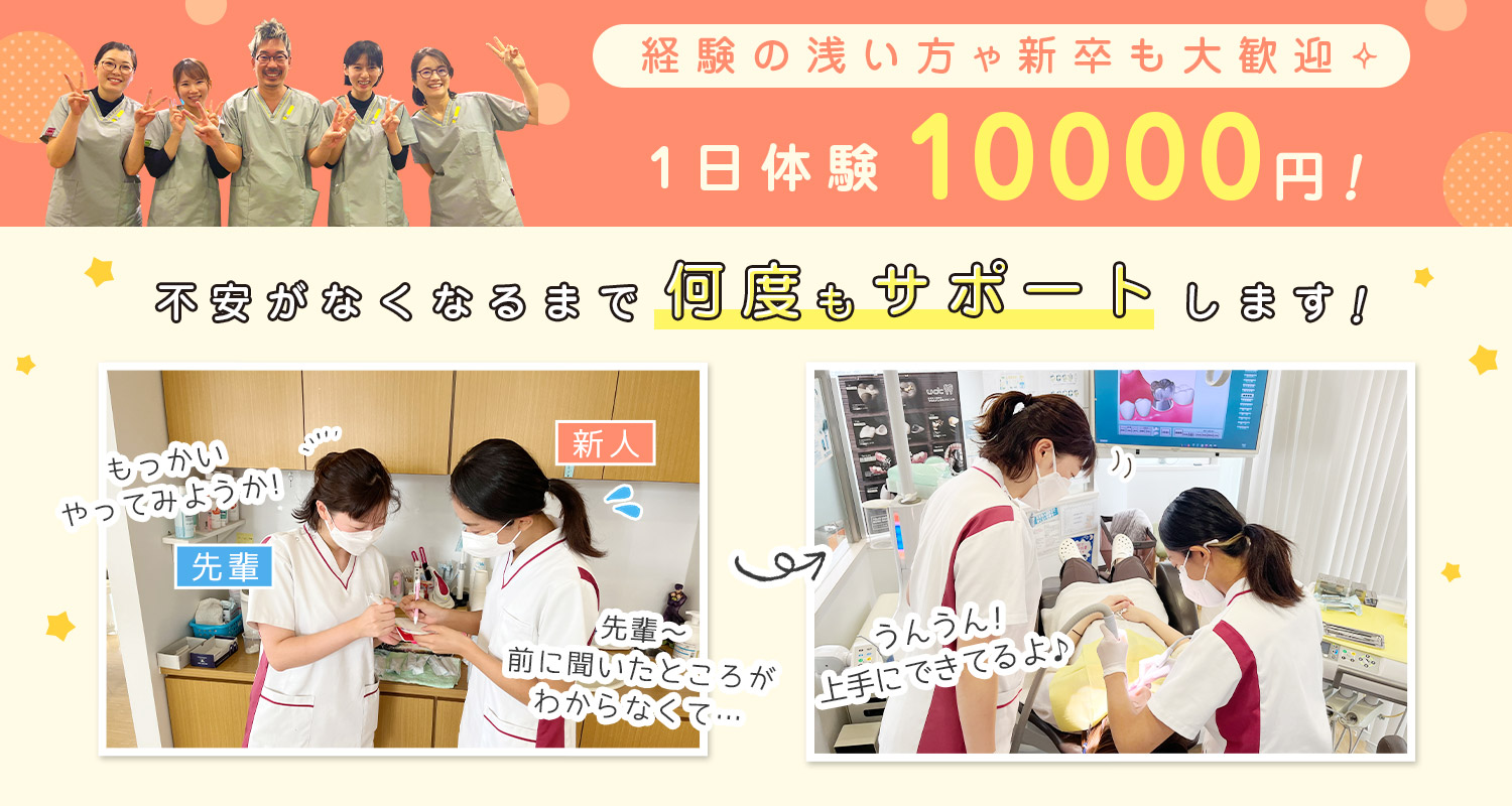 | 仕事内容 | 事務等から転職OKの受付・医療事務[社] 会計業務、電話対応、予約管理、カルテ等の事務業務。 未経験者でもご安心ください。 ※歯科助手業務はありません ☆未経験者やブランクがある方もOK スタッフが丁寧に指導しますので、ご安心ください! <全員未経験スタート> 受付は、2名体制なので経験が無い方でも安心してお仕事を初めていただけます! |