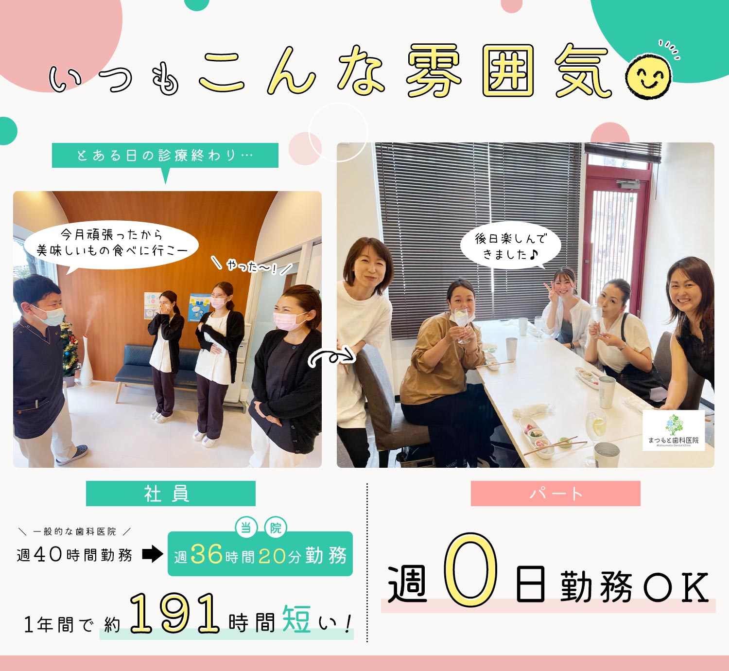 20代~40代活躍中で片付けも院長とスタッフ全員で取り組み、残業もほぼなし!