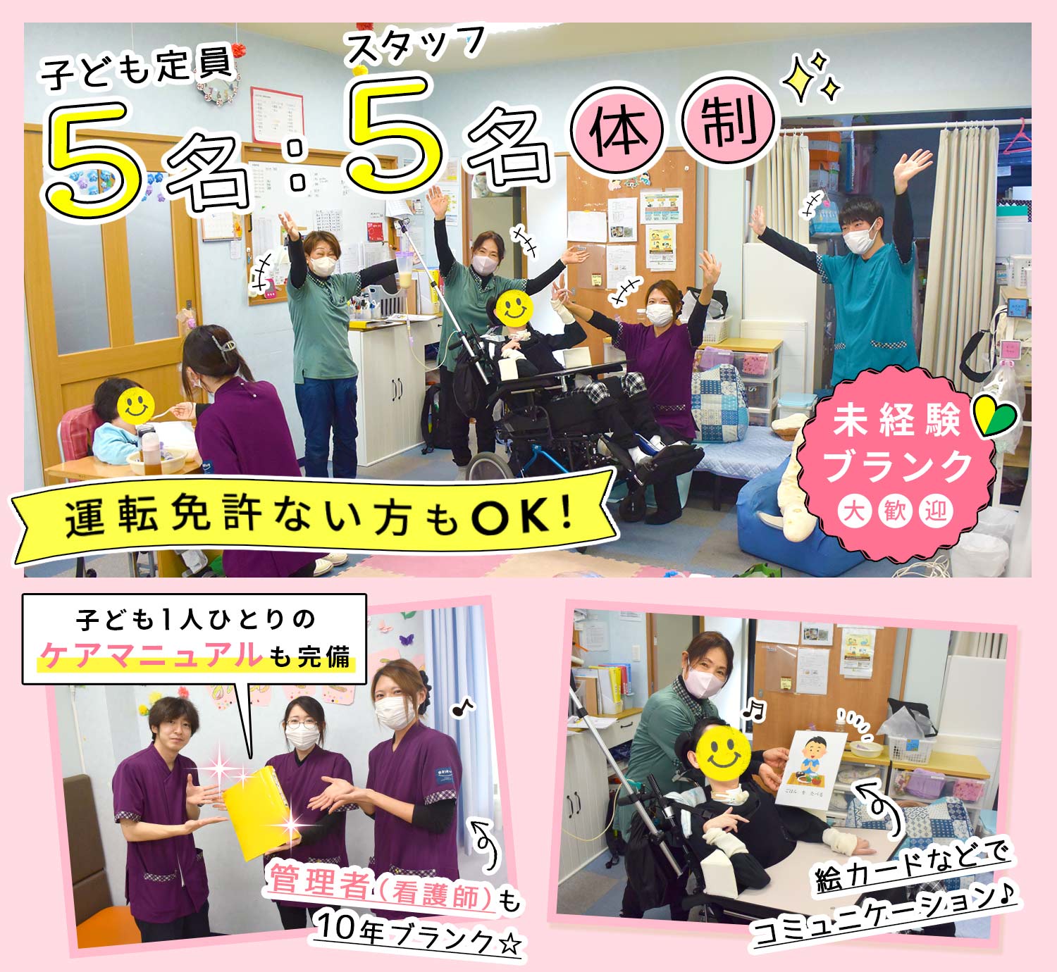 定員5名・重症心身障がいを持つ子どもたちに対する療育・ケアをお願いします。