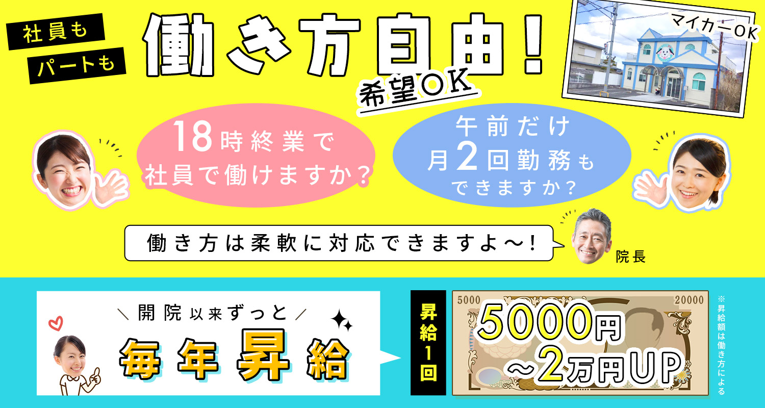 | 休日・休暇 | (1)完全週休2.5日制(火曜休診、他1日、他半日)+祝日 (2)完全週休3日制(火曜休診、他2日)+祝日 ※上記の働き方の他、希望に応じて自由シフトOK (例)完全週休2日だけど、週実働31.5時間の短時間社員 など <休暇>夏季(4日)、冬季(7日)、GW、産休・育休、有給、その他医院カレンダーによる  |