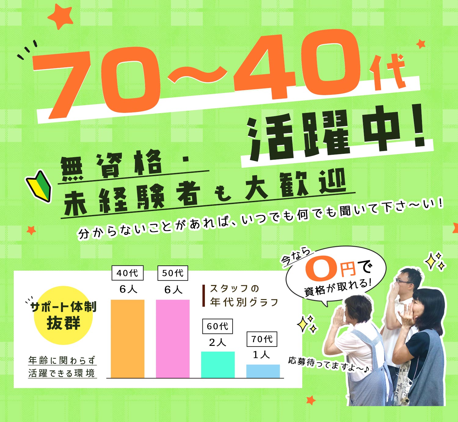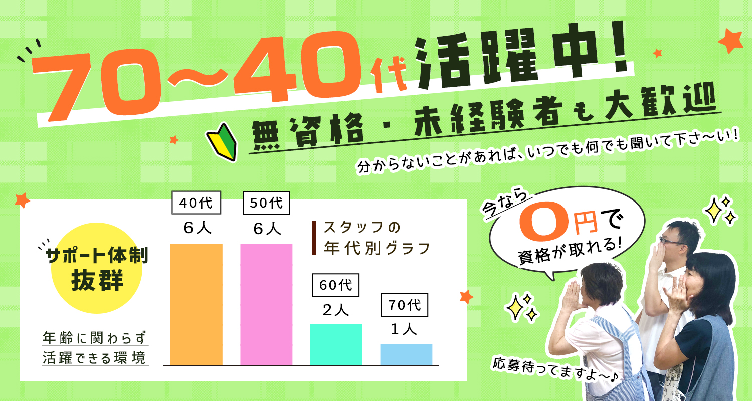 | 待 遇 | #昇給あり 各種社会保険完備(法定通り) 交通費規定支給(月2万円まで) #車通勤OK バイク・自転車通勤OK(駐車場無料・ガソリン代支給) 処遇改善加算 資格取得支援制度 資格手当 残業手当 社員登用制度 |