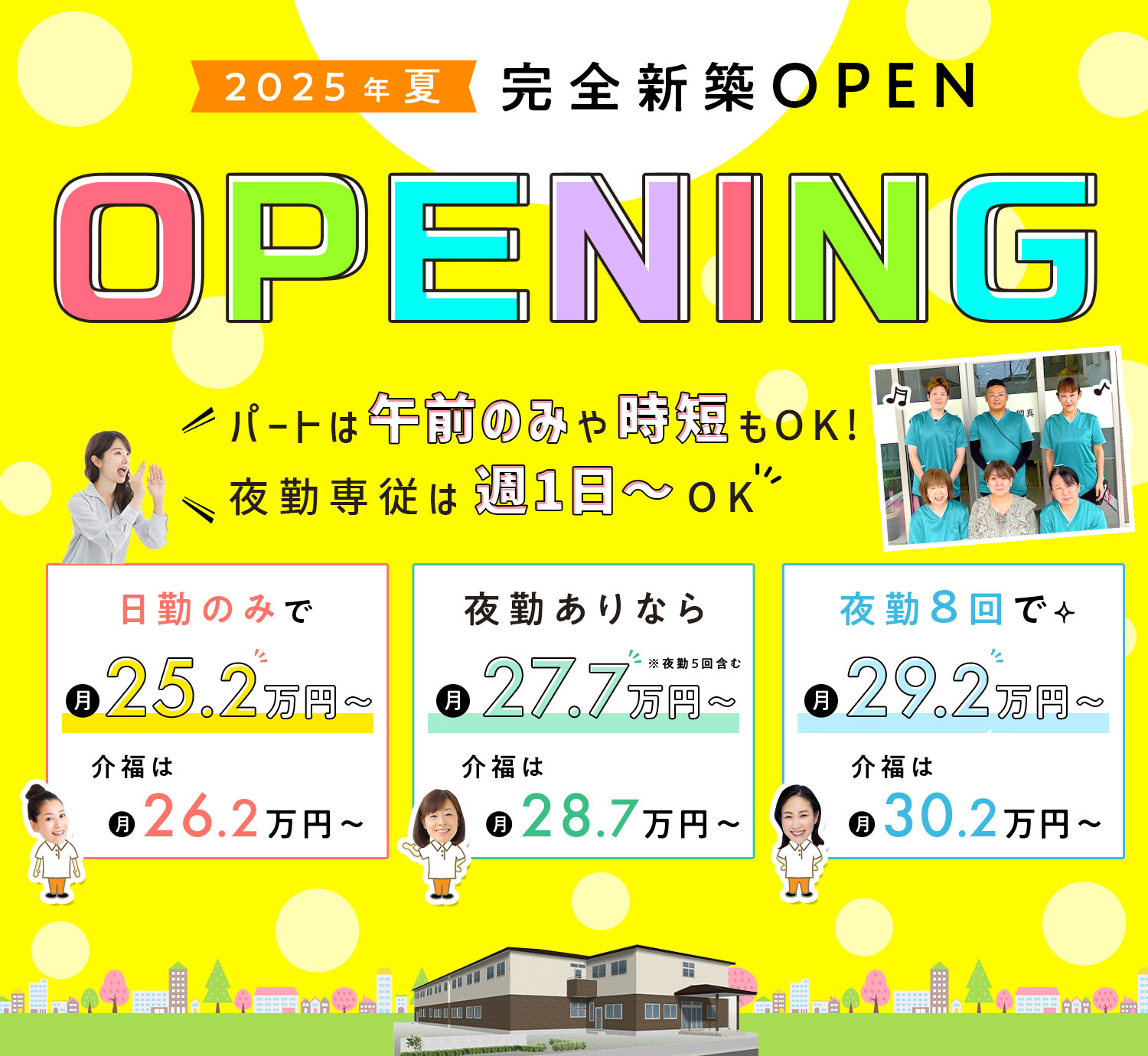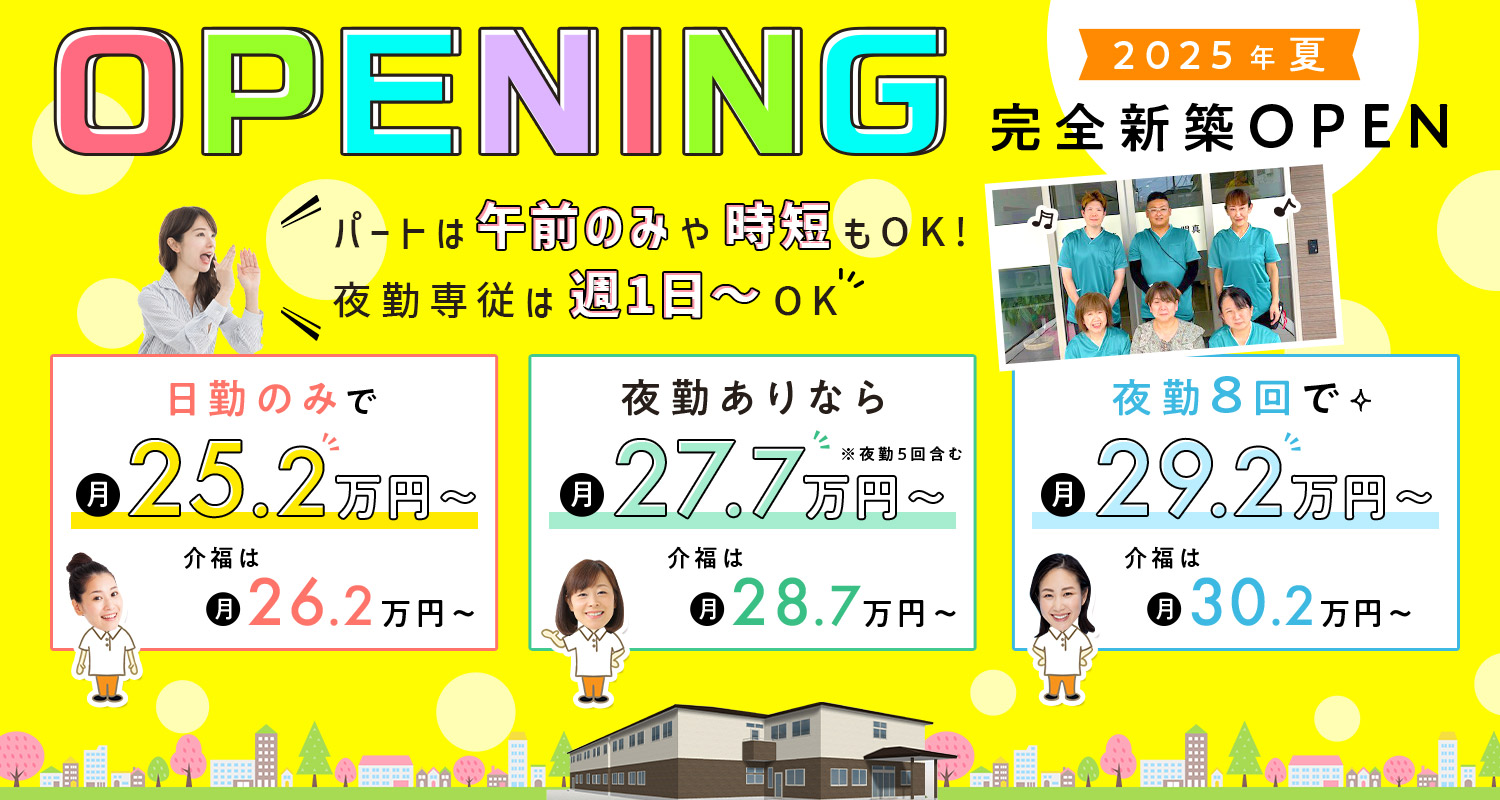 | 仕事内容 | (1)オープニングの介護職[パ] (2)介護福祉士/オープニング[パ] 定員49名の完全新築OPEN、住宅型有料老人ホームにて、 (1)入居者様の身の回りのお世話(食事・口腔ケア・入浴・排泄)などをお願いします。 (2)夜間の見回りや経過記録の記入、起床準備などもお願いします #オープニングスタッフ |