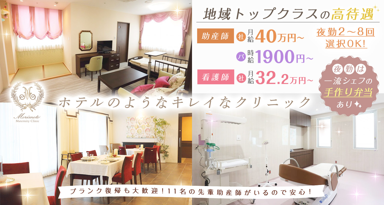 | 仕事内容 | 看護師[社] 当院は地域に密着したクリニックです。 病棟業務、分娩のサポート、母乳指導、その他。 ※助産師が外来を含め11名在籍しているので、サポート体制もバッチリ! ※夜勤体制:2名(助産師1名、看護師1名)※助産師2名の場合あり ◆産婦人科未経験の方、ブランクある方も大歓迎! 慣れるまでは、先輩スタッフがしっかりフォローする体制を整えています。 無痛分娩未経験の方や「産婦人科に興味があり、チャレンジしてみたい!」という方も、丁寧に指導していきますので、是非ご応募ください♪ ◆外来・病棟どちらにも携われる! 「患者様一人一人とゆっくり関わりたい!」という思いから、外来・病棟のどちらも勤務していただきます。 両方携わることで、産前の状況や患者様の性格・こだわりを把握できるので、患者様の満足度向上とスタッフの働きやすさ向上に繋がっています。  |