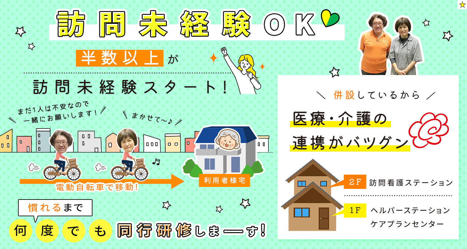 | 仕事内容 | 訪問看護師[社] 当社運営の施設、もしくは在宅の利用者様の医療処置、状態観察、服薬管理、ADL介助などの訪問介護業務をお願いします。 ■移動手段…電動自転車(車やバイクでの移動なし) ■訪問エリア…事業所から電動自転車で15分圏内 ■訪問件数…平均6件 ■訪問先…居宅5割、施設内訪問5割(グループ運営の住宅型施設・グループホーム) <手厚い研修体制> 同行研修は経験に応じて約2週間~1ヶ月ほど行いますが、不安がなくなるまで何度でも先輩との同行研修を行います! □□□ <利用者様は複数の看護師で担当> 気になる事があっても一人で抱え込まずすぐに仲間に相談できる他、急なシフト変更などもフォローをお願いしやすく、安心して働けます◎ <車での移動なし!運転免許不要> 訪問先は電動自転車(貸出あり)で、片道15分圏内の近隣エリアのみ。 車やバイクでの移動がないため、運転免許は必要ありません。  |