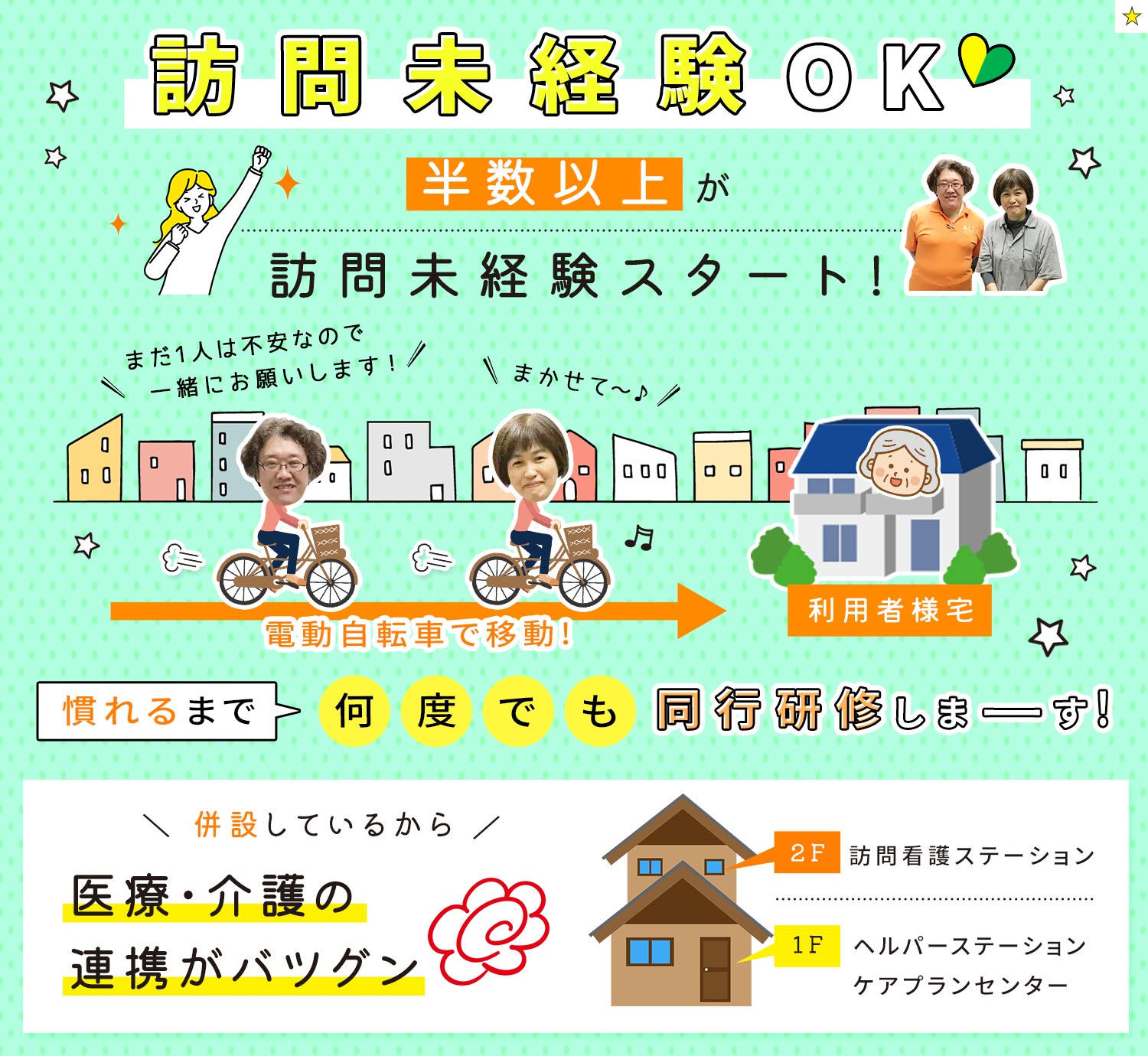| 応募資格 | 正看護師 #ブランクOK □□□ ※訪問未経験・病棟からの転職歓迎 ※電動自転車で訪問できるため、運転免許等は不要 ※シニアやミドルも歓迎  |