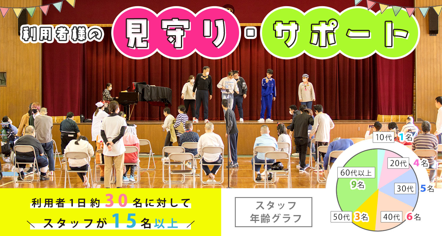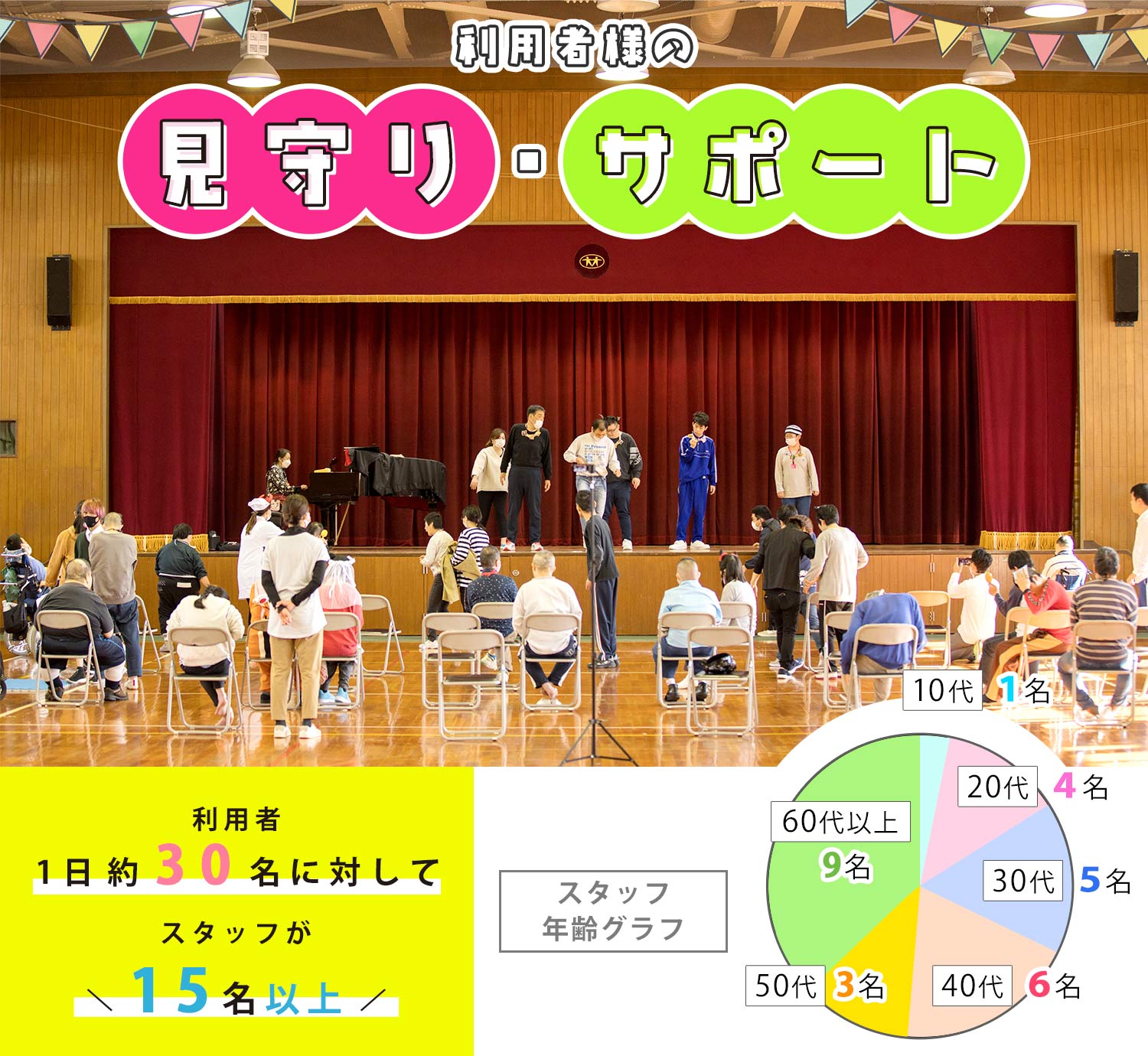 1日約30名の利用者様に対して、15名以上のスタッフで対応◎