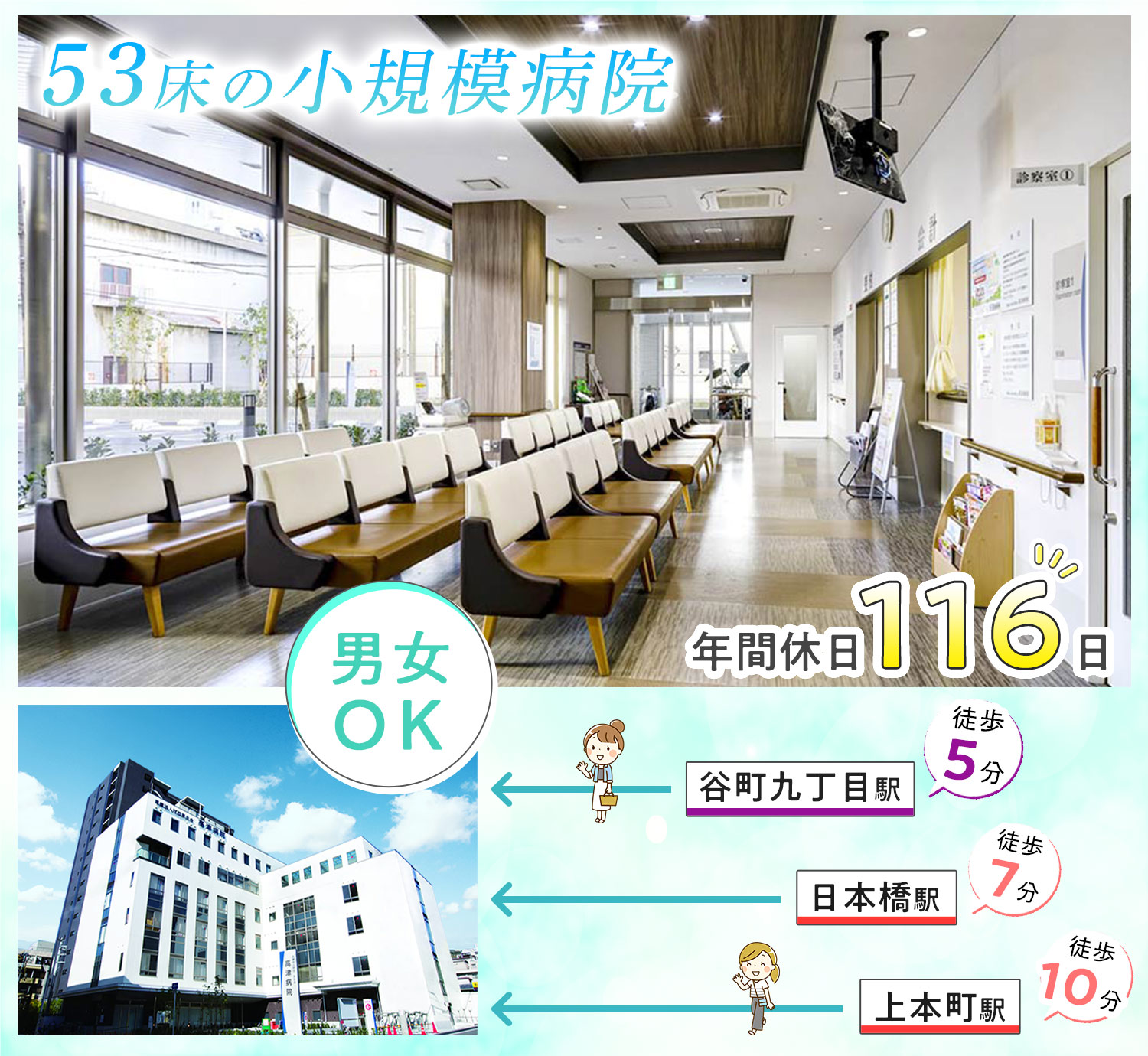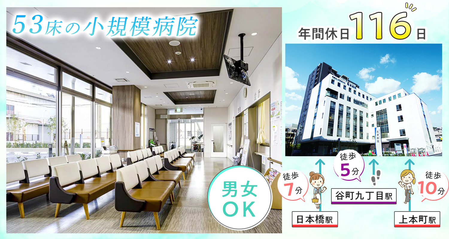 | 仕事内容 | 看護師[社] パートの看護師[パ] 病床数53床の小規模病院(病棟)での看護師業務。 医師のサポートおよび、患者様への看護業務全般をお願いします。 ※社員で、日勤のみ勤務も希望相談OK ※ブランクからの復帰を目指す方も安心 最初は丁寧に研修を行いますし、みんなでサポートします◎ |