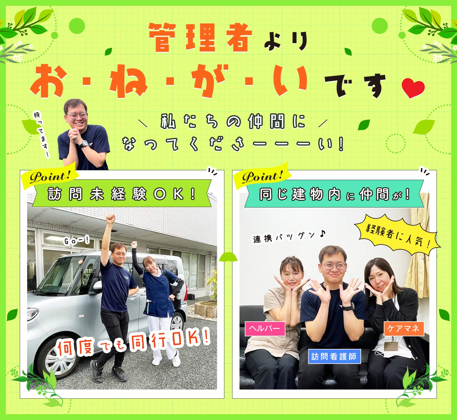最初は慣れるまで何度でも同行しますので安心してご応募くださいね。