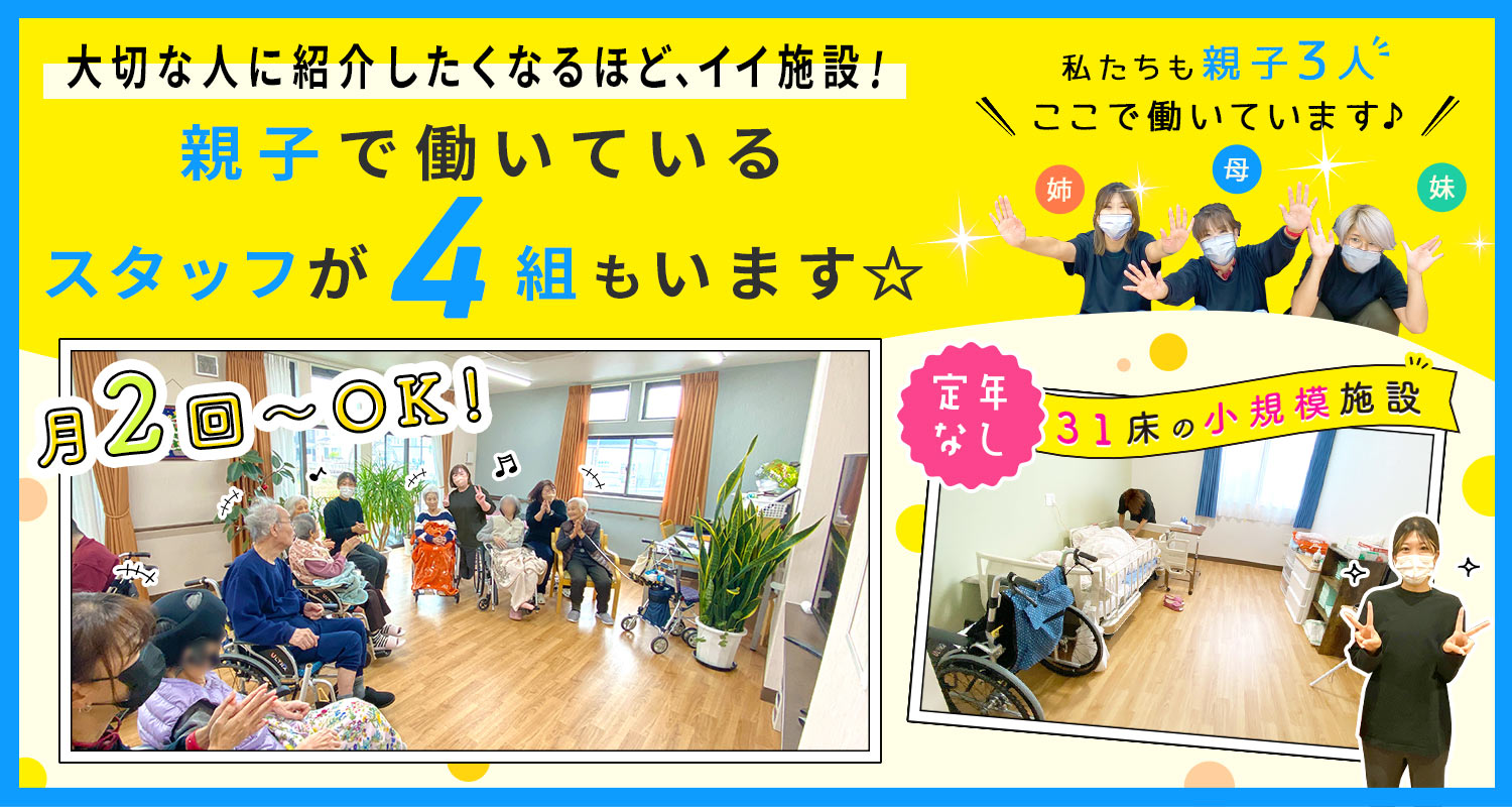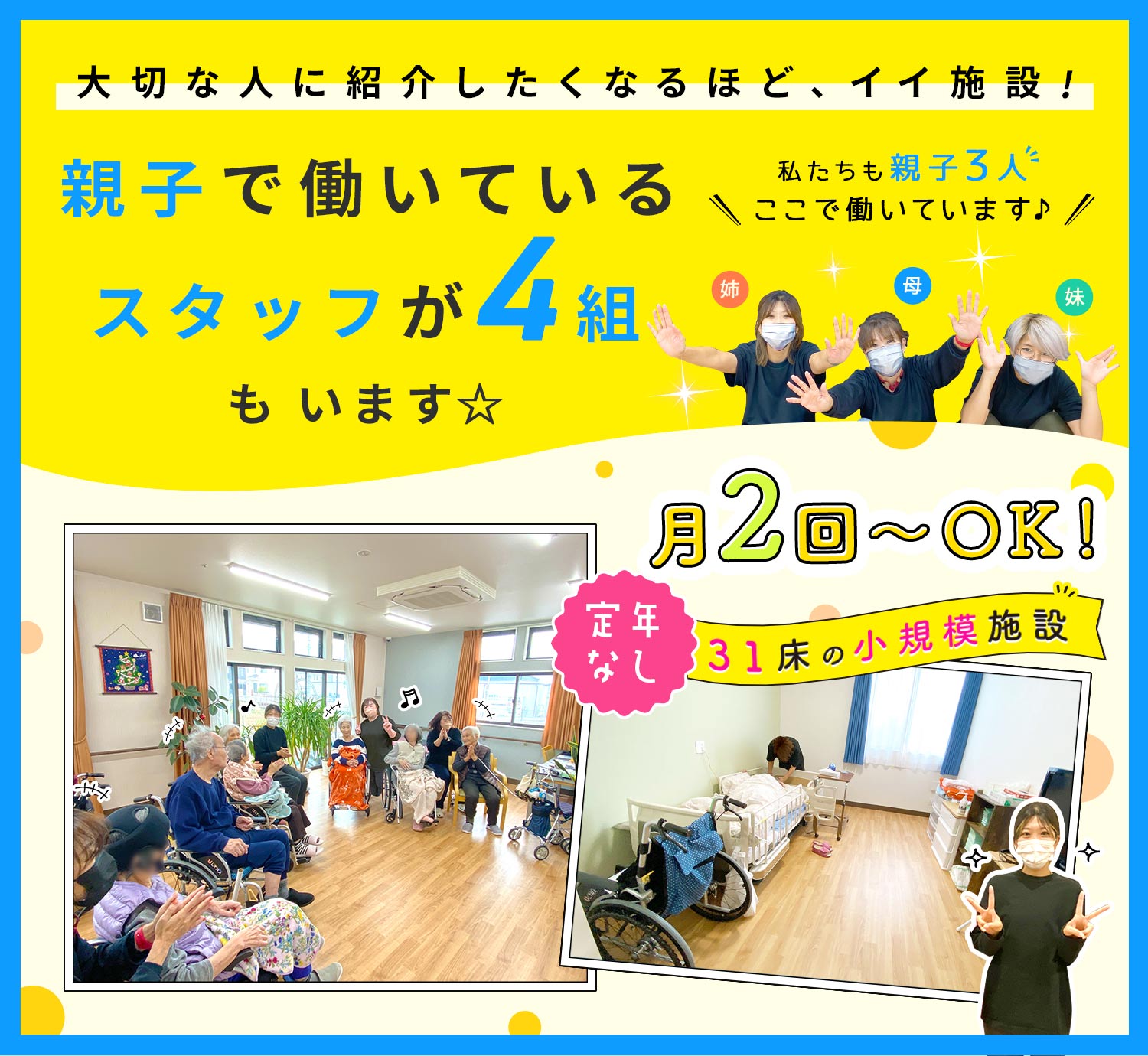 | 仕事内容 | 月2回OKの介護/定年なしの介護職[パ] 31床の小規模施設(サービス付き高齢者向け住宅)にて、 入居者様の生活のサポート(食事・口腔ケア・入浴・身体介助など)をお願いします。 ※身体介護と生活支援の割合は、おおよそ6:4 ※介護記録はタブレットで入力 紙の記録に比べてスピーディーでかんたん!慣れていない方もスグに使いこなせますよ。 入居者様のケア中に分からないこと・不安なことがあれば、いつでも連絡や声掛けができる体制! 施設内には仲間がたくさんいるので、遠慮なく頼ってくださいね。 |