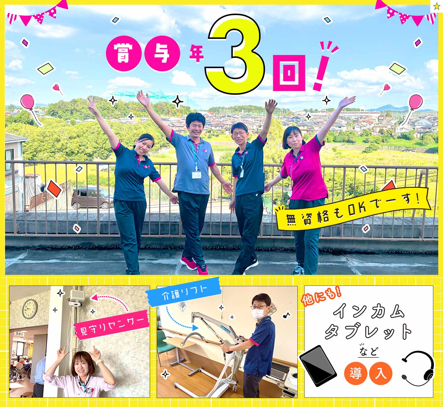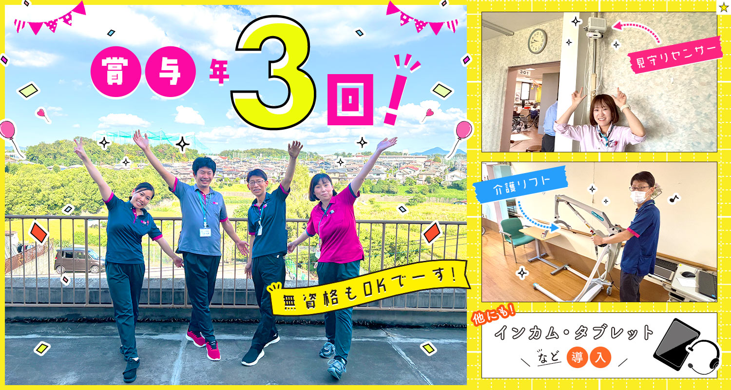 | 待 遇 | #賞与あり 年3回(3.8ヶ月分) #昇給あり #昇格あり 社会保険完備 交通費規定支給(公共交通機関を利用の方:上限月2万5000円、車・バイク・自転車通勤の方:上限月1万2900円) 扶養手当 (配偶者月1万円、子4500円※2人目まで) 家賃補助手当 (上限月1万8000円) #車通勤OK (駐車場完備) バイク・自転車通勤OK 制服貸与 資格取得支援制度 (実務者研修の受講費用補助) 退職金制度 (勤続3年以上) 定年制あり (60歳) 再雇用制度あり 髪型・髪色自由  |