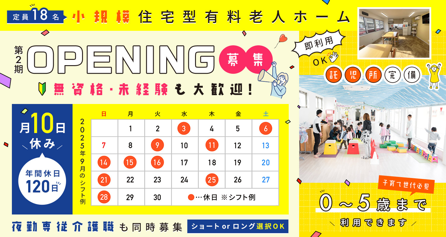 | 休日・休暇 | 月10日休み(シフト制) ※年間休日120日 <休暇>夏季、年末年始、有給、慶弔、産休・育休、介護 |