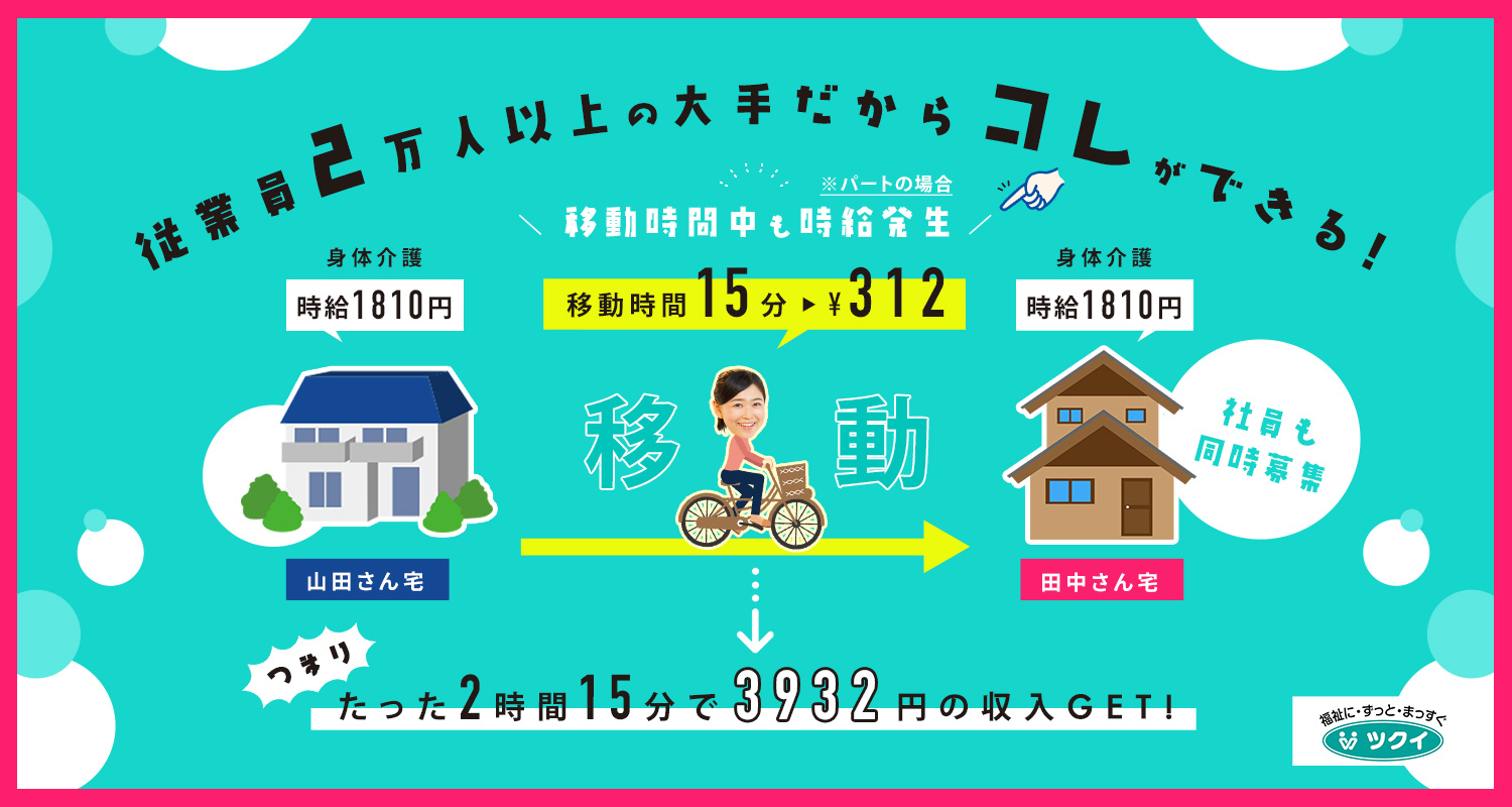 | 給 与 | 時給1310円~2240円 <詳細> a.身体介護…時給1810円(身体介護手当含む) b.生活援助…時給1310円 ◆土日祝は時給100円UP a.時給1910円~ b.時給1410円~ ◆18:00~22:00は時給300円UP a.時給2110円~ b.時給1610円~ ◆土日祝の18:00~22:00は時給400円UP a.時給2210円~ b.時給1710円~ ※特定事業所加算手当含む ※別途、ICT手当支給(月2000円) ※移動時間中も時給発生 ※試用期間あり(3~4ヶ月)/同条件 |