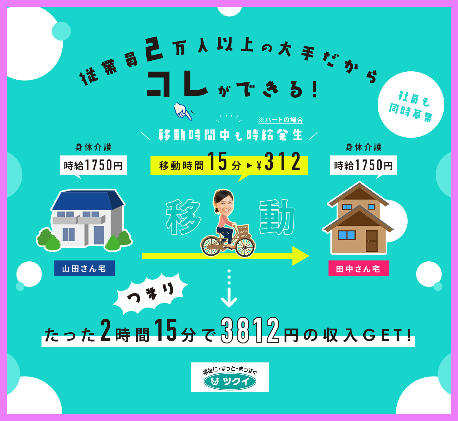 | 待 遇 | #賞与あり 年2回 #昇給あり 社会保険完備 交通費実費支給 (月5万円まで) 母(父)子育児手当 (18歳未満の子:月1万円) 特別手当 時間外勤務手当 ICT手当 (月2000円) キャリアパス制度 産後パパ育休制度 公的資格取得・自己啓発支援制度 エプロン貸与 休憩スペースあり(電子レンジ・冷蔵庫使用OK) 髪型・髪色自由 (社内規定あり) ネイル・まつげエクステ・ひげOK (社内規定あり) ツクイPLUS(独自の福利厚生) ◎結婚・出生・入学のお祝い金の給付 (5000円~2万円) ◎宿泊費の補助 (7000円/年1回) ◎ヘルスチェック補助として最大1万円給付 など |