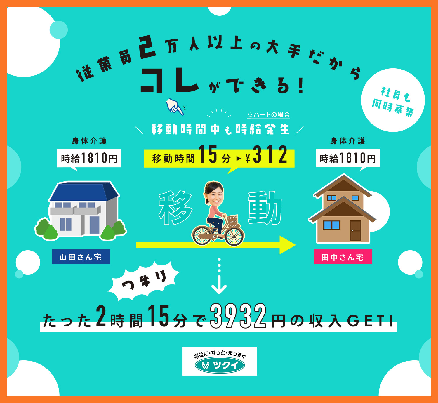 | 待 遇 | #賞与あり 年2回 #昇給あり 社会保険完備 交通費実費支給 (月5万円まで) 母(父)子育児手当 (18歳未満の子:月1万円) 特別手当 時間外勤務手当 ICT手当 (月2000円) キャリアパス制度 産後パパ育休制度 公的資格取得・自己啓発支援制度 エプロン貸与 休憩スペースあり(電子レンジ・冷蔵庫使用OK) 髪型・髪色自由 (社内規定あり) ネイル・まつげエクステ・ひげOK (社内規定あり) ツクイPLUS(独自の福利厚生) ◎結婚・出生・入学のお祝い金の給付 (5000円~2万円) ◎宿泊費の補助 (7000円/年1回) ◎ヘルスチェック補助として最大1万円給付 など |