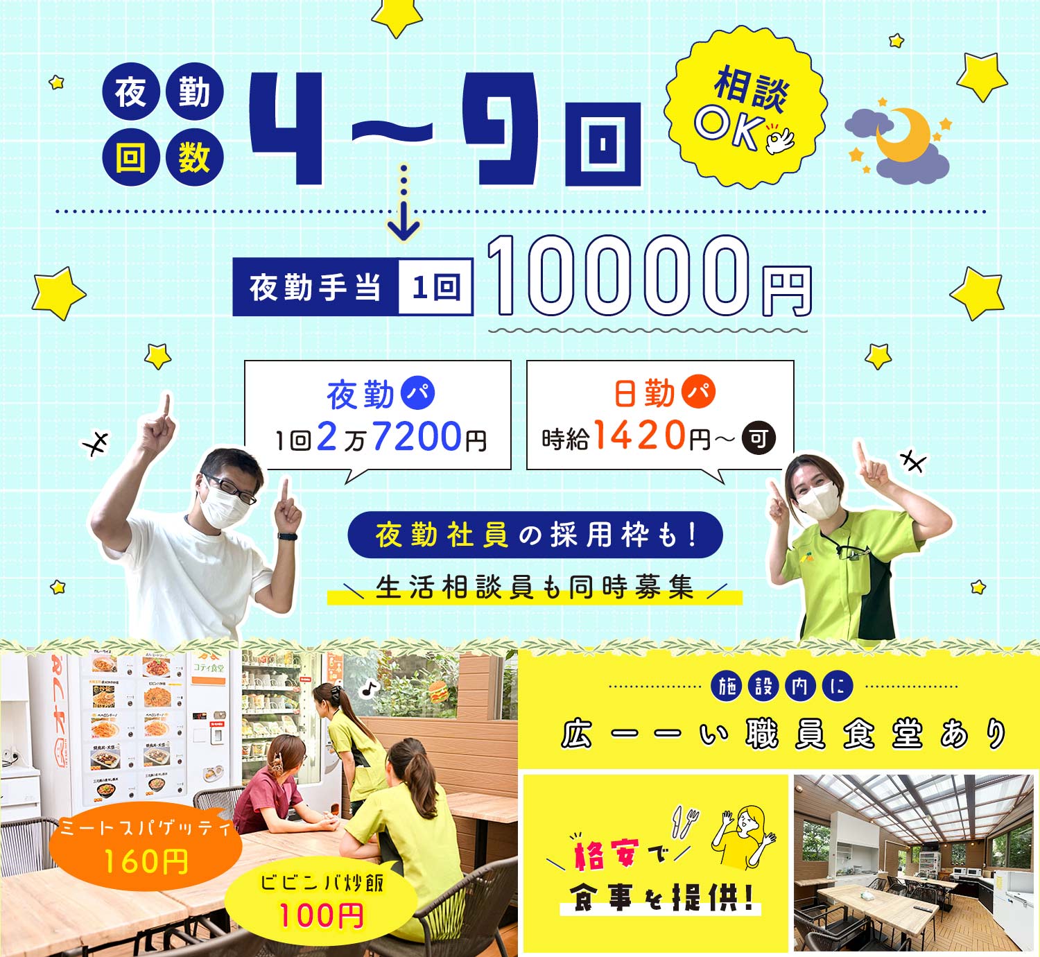 | 勤務時間 | 早出/7:00~16:00 日勤/9:00~18:00 遅出/12:00~21:00 ※休憩60分 ※早出のみや遅出のみなど固定シフトOK |