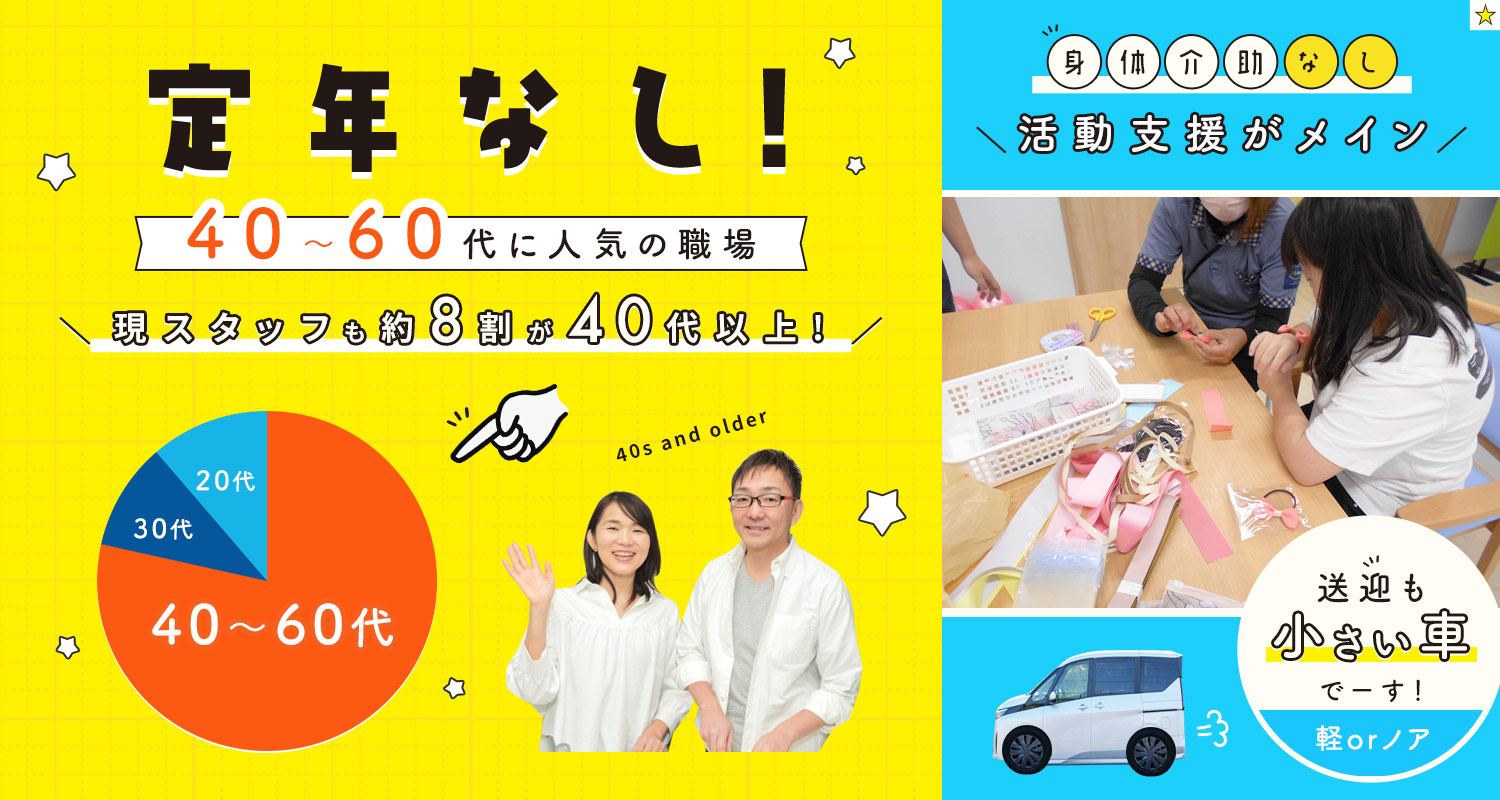 | 仕事内容 | (1)介護福祉士・夜勤なしのチーム介護[社] (2)障がい者支援の介護/シニアやミドルも歓迎[社] 地域密着型の障がい通所支援事業所(生活介護)になります。 日中活動の支援の他、利用者様の身の回りの介助をお願いします。 ・各種活動のお手伝い(アロマストーンやリボン作りなどの生産活動等) ・各利用者様の状態に応じた援助・見守り ・レクリエーションの企画実施 ・ウォーキング、外出の支援 など ★仕事の9割が利用者様の活動支援です! ★身体を抱えるなど負担の大きな身体介助はほぼありません。 □□□ <送迎業務について> 車種:ノアor軽自動車 送迎エリア:45分以内(箕面市内周辺) ※車の運転が苦手な人も空いている時間に練習できます! <手厚い人員体制> 1日15名ほどの利用者様に対し、支援員は5名体制◎ 全員が同じフロアに集まって作業しているので、困った時はすぐにフォローを呼べたり、心身ともにゆとりを持って支援ができる環境です☆ ※利用者数:1日15名ほど(定員20名。20代の方が中心) ※スタッフ:支援員5名+看護師2名  |