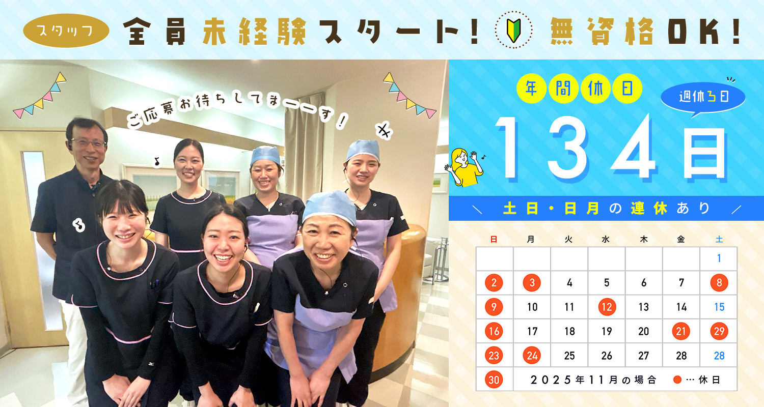 | 仕事内容 | (1)歯科助手・受付事務/週休3日制[社] (2)歯科助手・受付事務/保育士[社] 患者様の受付・会計・予約管理、治療のアシスタント(器具の準備や片付け)などをお願いします ◆受付事務 お会計や予約やカルテ管理など、医院の顔としてのポジションです!笑顔で優しく挨拶をしてくださる方であれば活躍できますよ。 ◆アシスタント(助手業務) 治療で使う器具の準備、片付け、診療補助をお任せします。 器具の名称などを覚えるのに、半年程かかりますが、一度覚えてしまえば一生、活かせるスキルになります!  |
