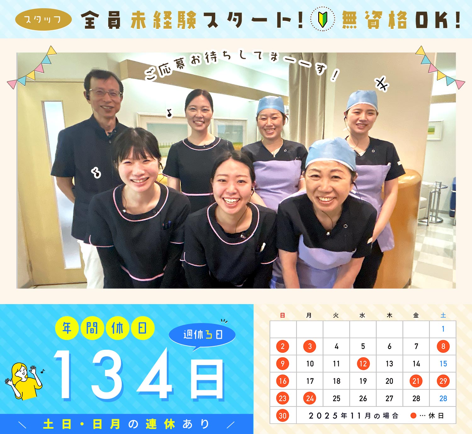| 休日・休暇 | 週休3日制(日曜+土or月+水or木)、祝日 ※基本月2回、週3日休み(月の半分は週2日休み) ※月2回以上、土日・日月連休あり ★年間休日134日 <休診日> 第1.3.5の木曜日 第2.4の土曜日 日曜日+祝日 <休暇> 春季、夏季、年末年始、産休・育休、介護、有給休暇  |