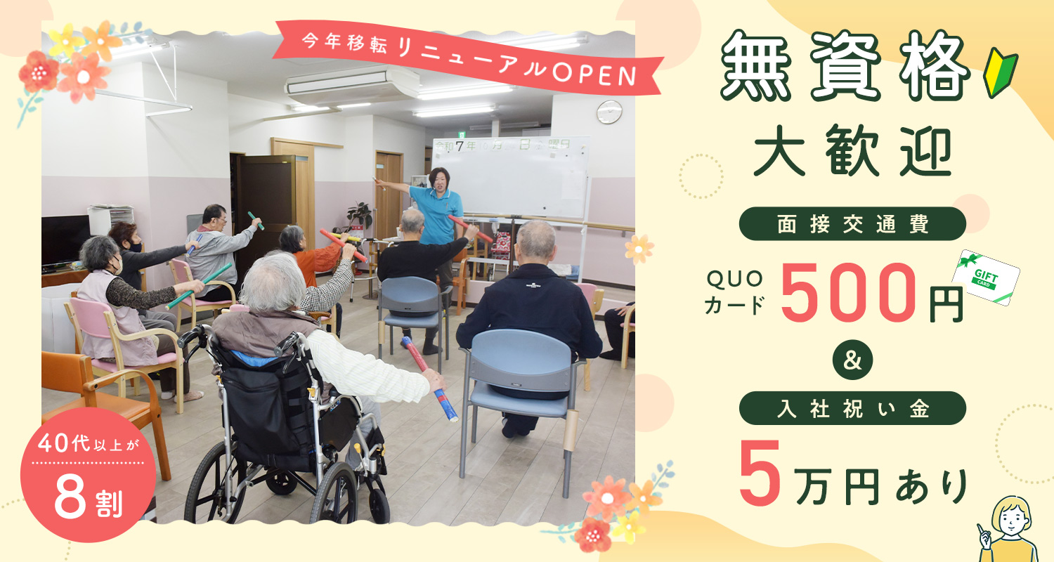 | 仕事内容 | デイサービスの介護職[社] 今年移転リニューアルオープンの綺麗な小規模デイサービス(定員18名)。 利用者様の身の回りのサポート(入浴や食事など)、レクリエーションの企画・実施、健康チェック、リハビリ補助などの介護業務をお願いします。 ※元気な利用者様が中心 利用者様の目標や思いをどうすれば達成させてあげられるか、一人ひとりに寄り添うリハビリや介助・サポートを提供しています。 ※1日あたりスタッフ約5〜6名のゆとりある体制! ※無資格・未経験の方は、入社後は身体介助がない業務からスタートし、段階を踏んで食事介助、入浴介助など丁寧にお教えするので安心! ※慣れてきたら送迎もお願いします。 朝と夕方に利用者様2名程の送迎。基本、片道15分以内なので運転の負担も少なめです! |