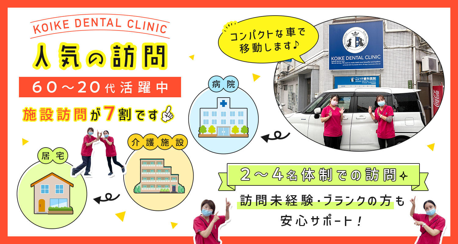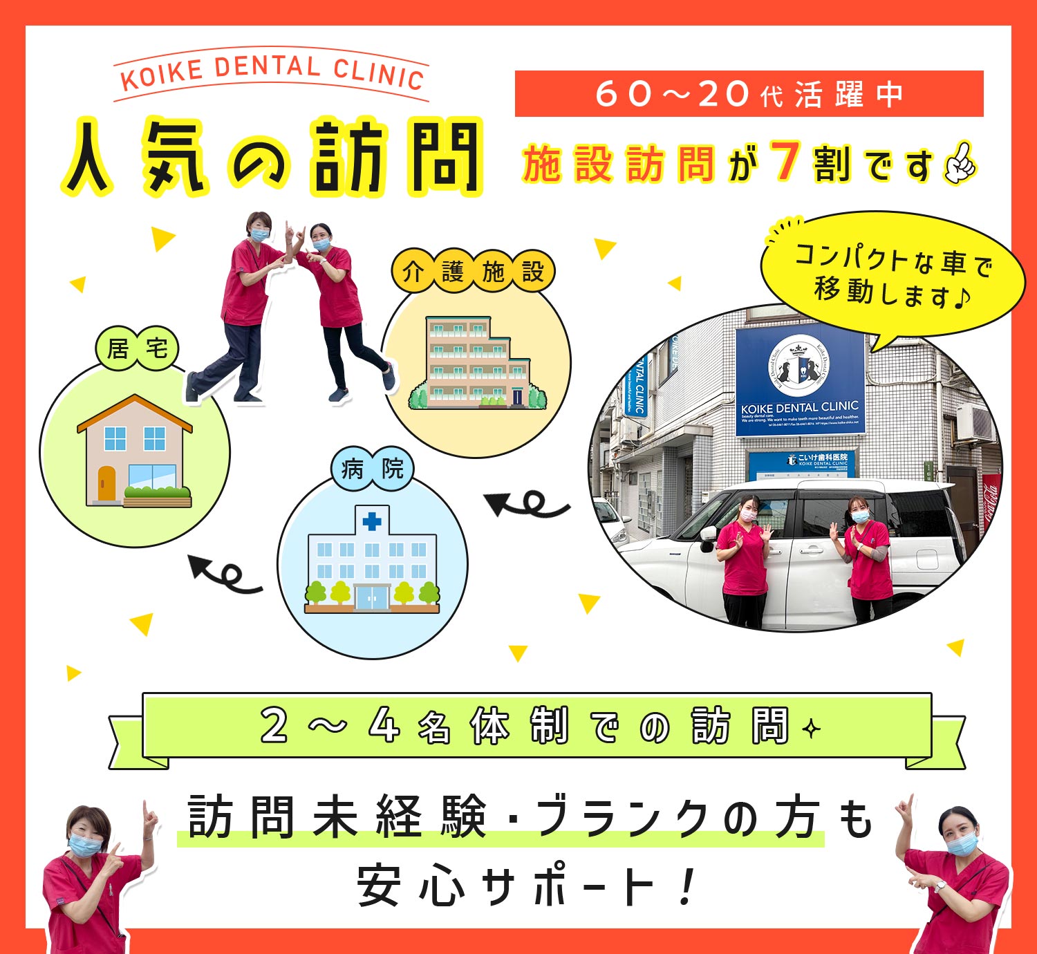 | 仕事内容 | 訪問の歯科衛生士[社] 介護施設をはじめ、居宅や病院といった訪問先での衛生士業務。 医師のサポートや予防処置(歯石の除去や薬物の塗布)、患者様への歯磨き指導などをお願いします。 □□□ <チームで訪問> 訪問先には必ずドクターと衛生士1~2名、訪問先によっては訪問助手・コーディネーターも加わりチームで向かいますので、訪問診療が初めての方もご安心くださいね。 なお、車の運転はないため運転免許は不要です。(あれば尚可) |