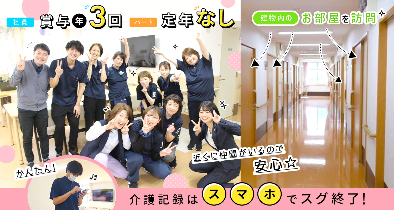 | 応募資格 | 介護職員初任者研修修了(旧ヘルパー2級)以上 #ブランクOK ※実務経験・男女不問 ※ミドルも歓迎 |
