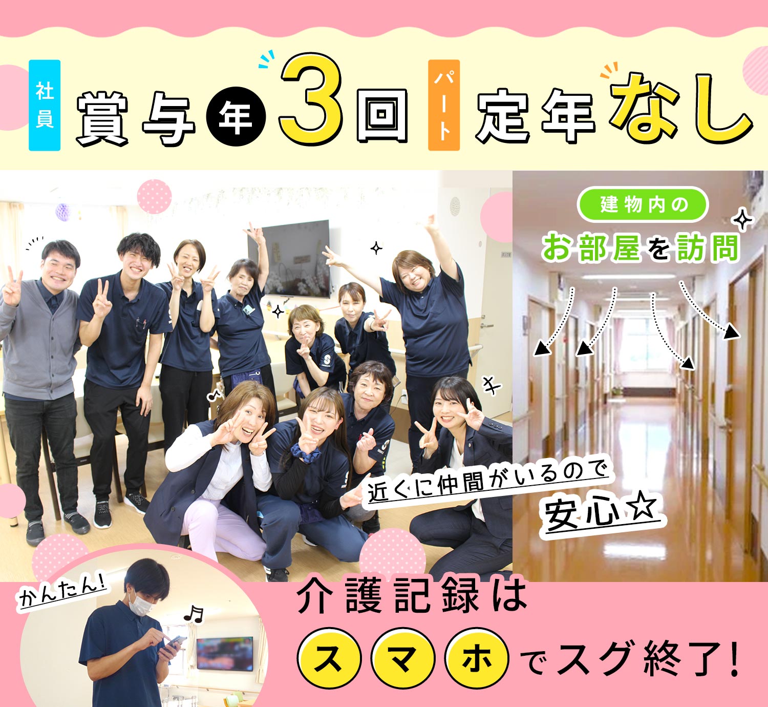 | 応募方法 | ◎ お気軽に【応募する】ボタンよりご応募ください ◎ 24時間受付中です <まずは見学も歓迎!※希望者のみ> 施設の雰囲気や一緒に働く仲間を見てからの応募でも大丈夫です。 □□□ 電話での応募も受付中! 「ジ ョ ブ ポ ス タ ー を見て応募したのですが」と、 お電話すると、スムーズです! |