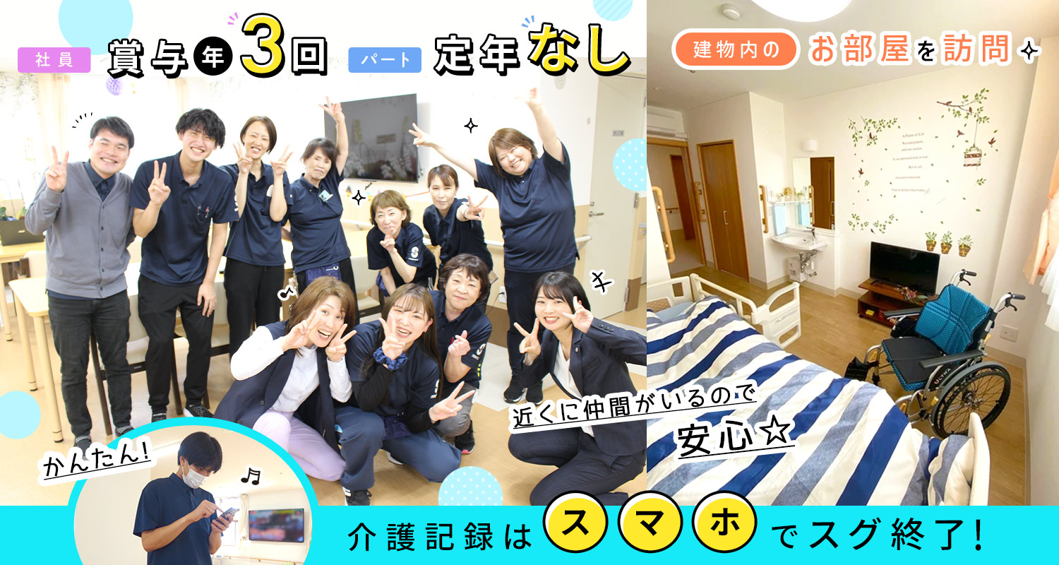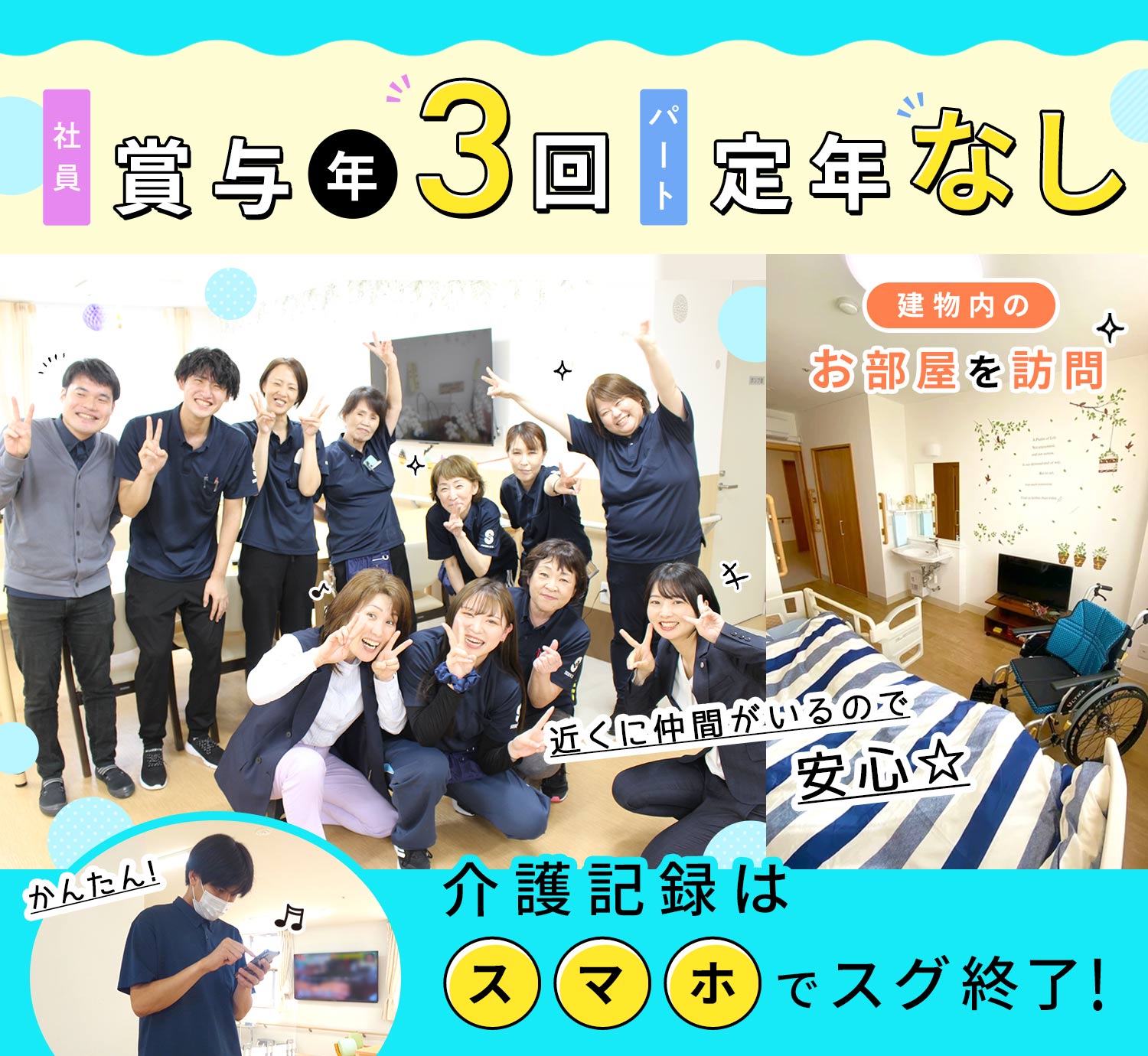 | 応募方法 | ◎ お気軽に【応募する】ボタンよりご応募ください ◎ 24時間受付中です <まずは見学も歓迎!※希望者のみ> 施設の雰囲気や一緒に働く仲間を見てからの応募でも大丈夫です。 □□□ 電話での応募も受付中! 「ジ ョ ブ ポ ス タ ー を見て応募したのですが」と、 お電話すると、スムーズです! |